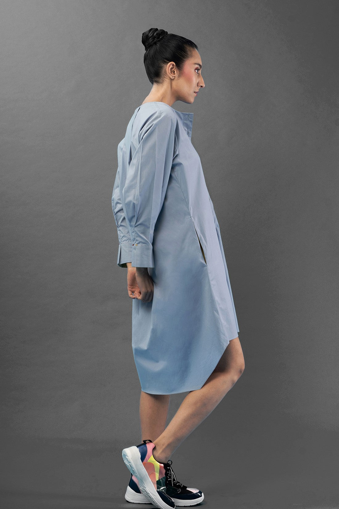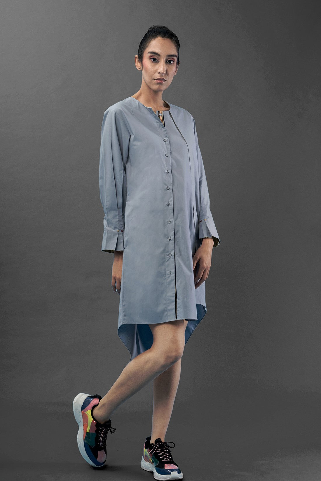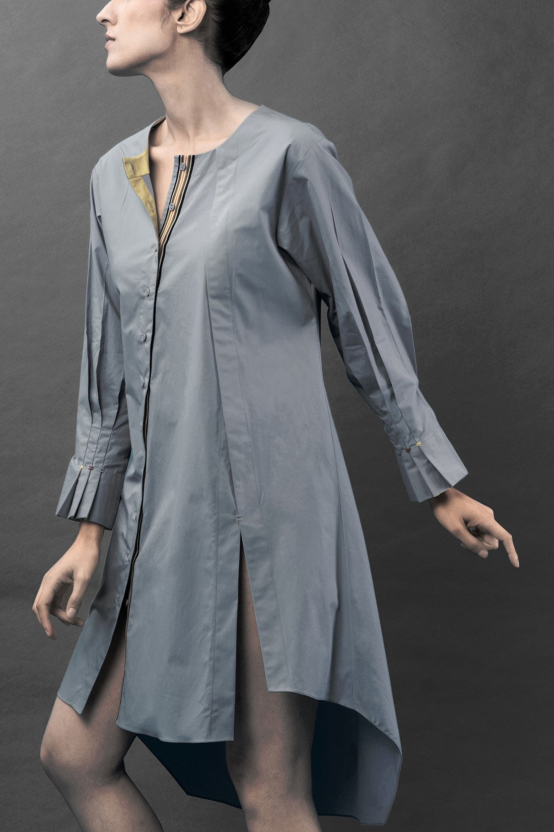 - Concealed button closure at the front