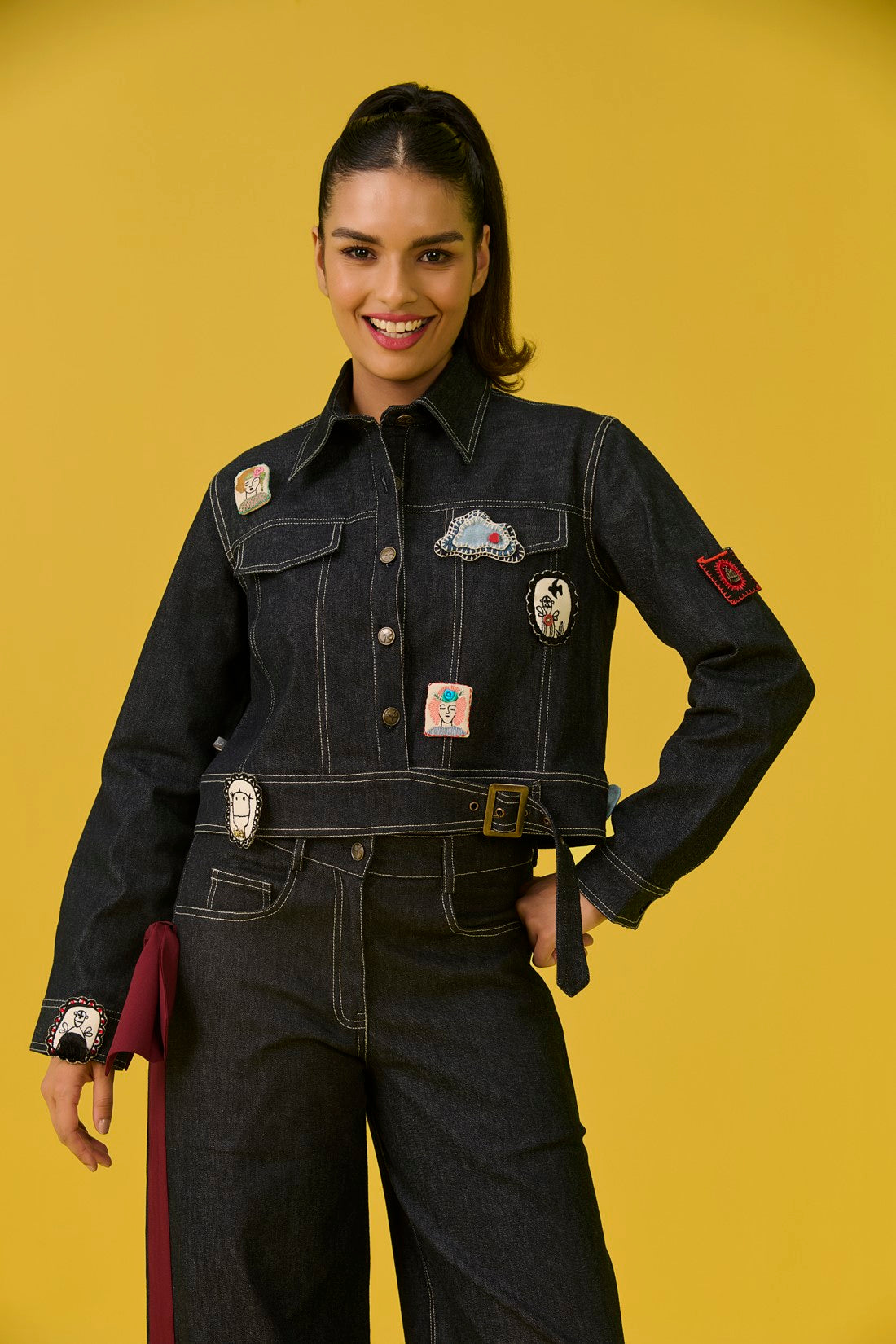 Crafted with impeccable precision, this denim jacket brings together classic denim toughness with an artful, offbeat edge - a playful parade of quirky embroidered brooches are scattered all over. Perfect for layering, perfect for standing out.