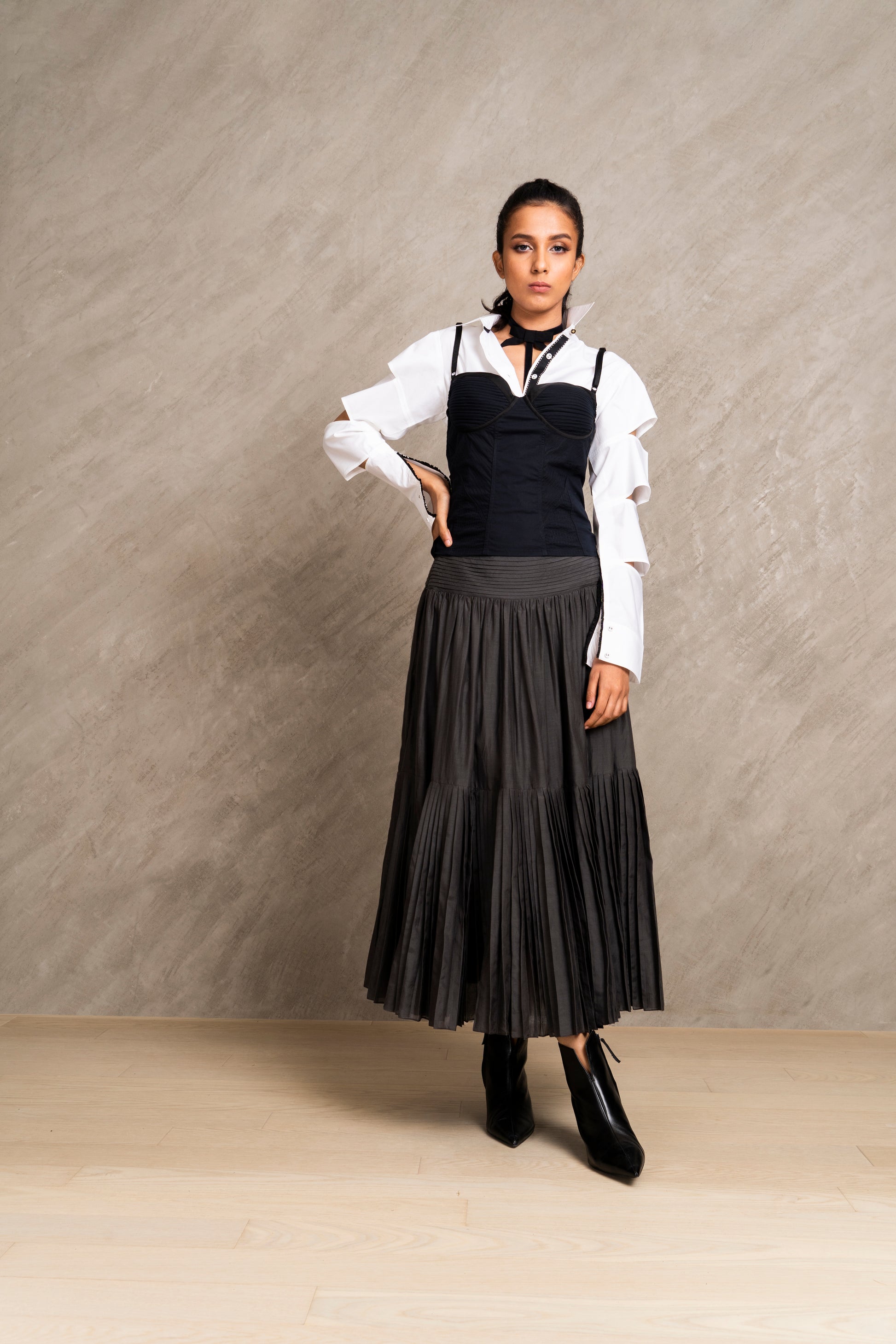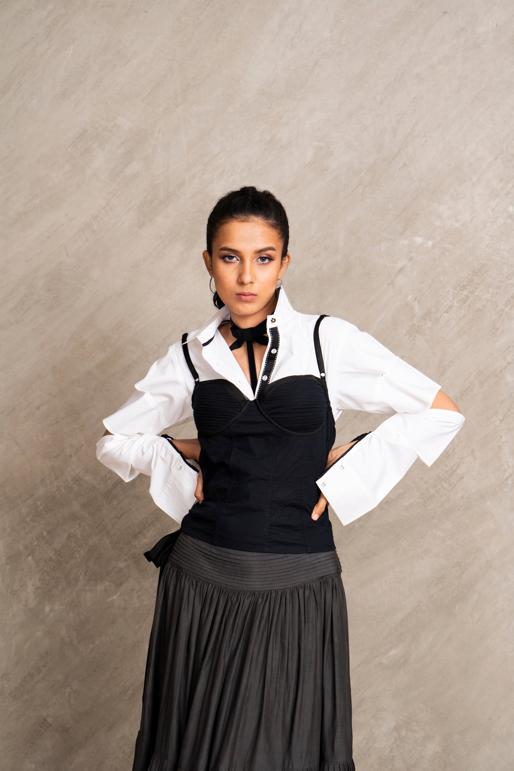 Spice up your modern attire with our black corset designed with cross tie at the back to hug the figure and adjustable shoulder straps with gold buttons for perfect fit. Game up your style quotient by layering the corset over ASTRID JR shirt and Lagantha long skirt