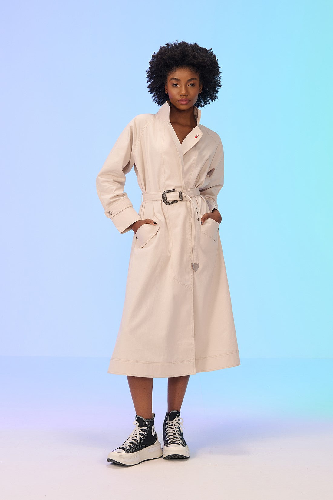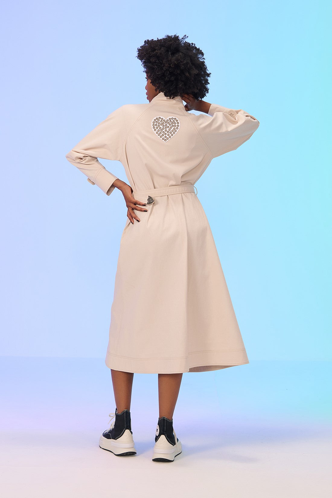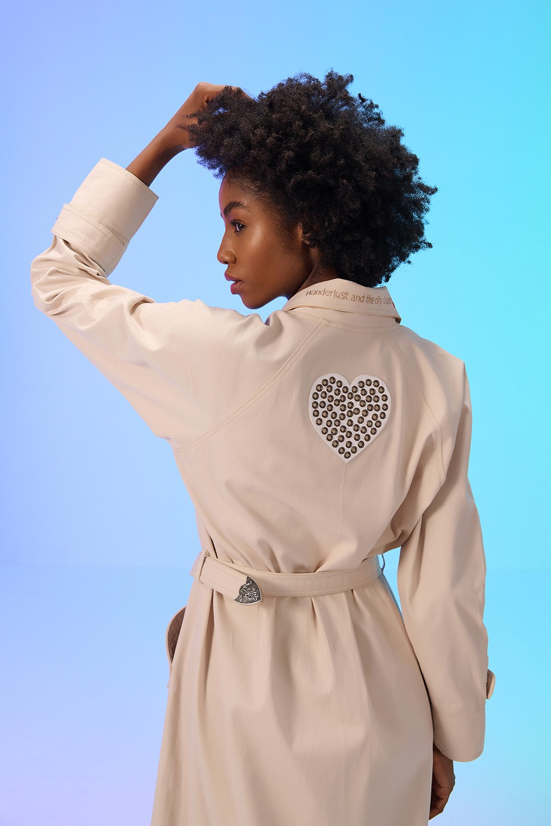 A chic denim overcoat with clean and classic cut, for casual day and evenings. With its whimsical theme and denim material, it’s a unique blend of playful and edgy style. Its adorned with a queen of hearts embroidery detailing on one collar lapel. Thos overcoat is sure to turn heads and add personality to any outfit.