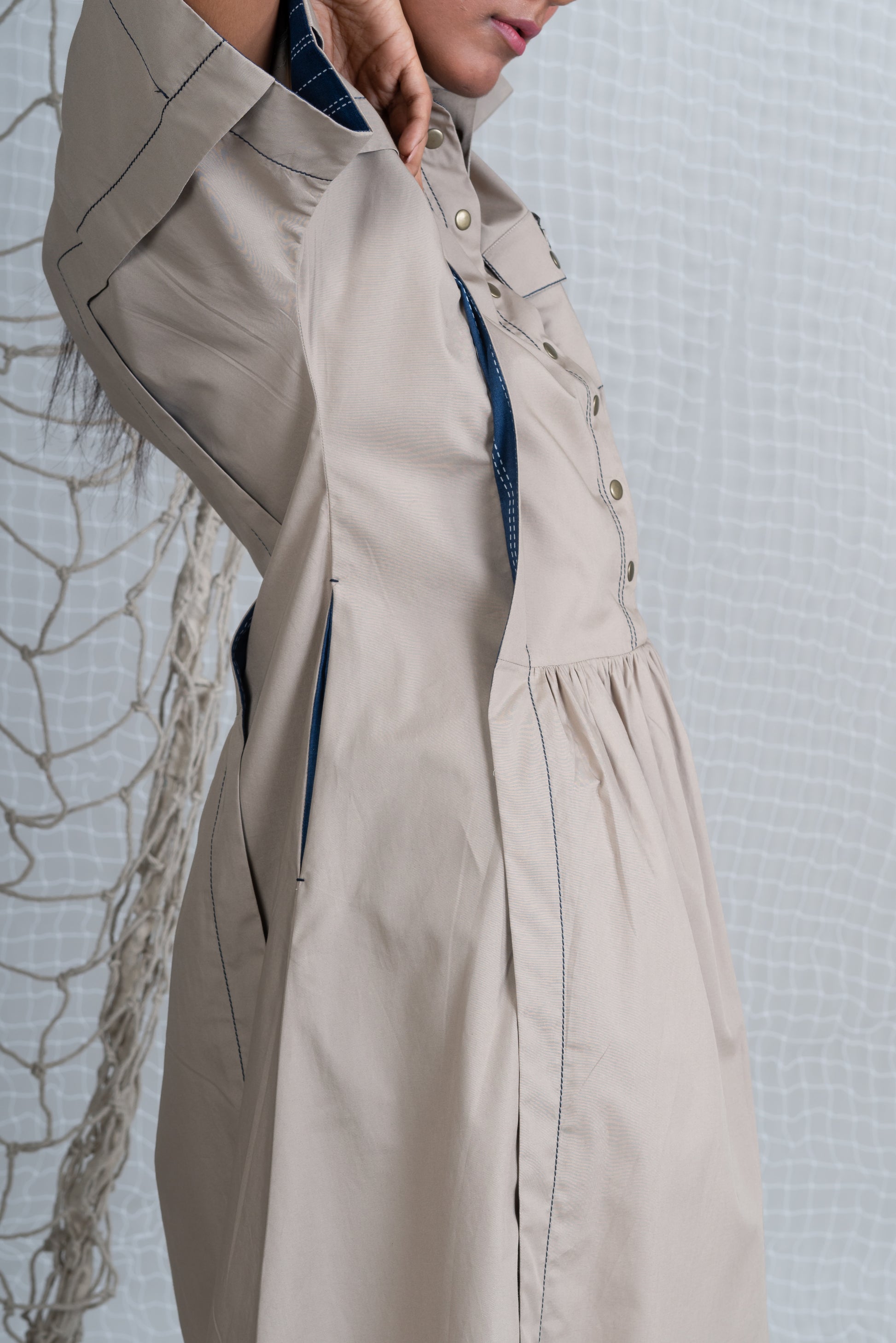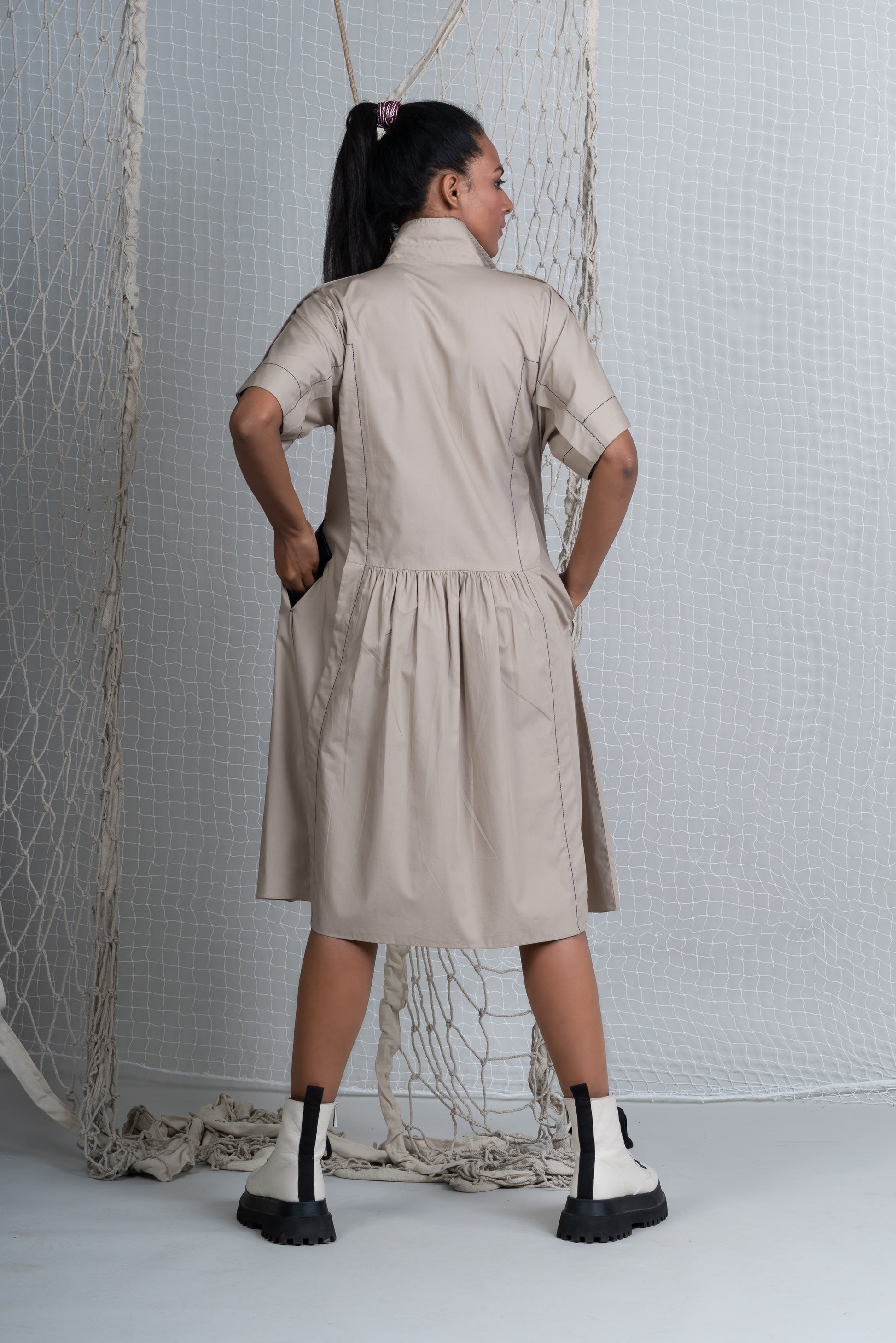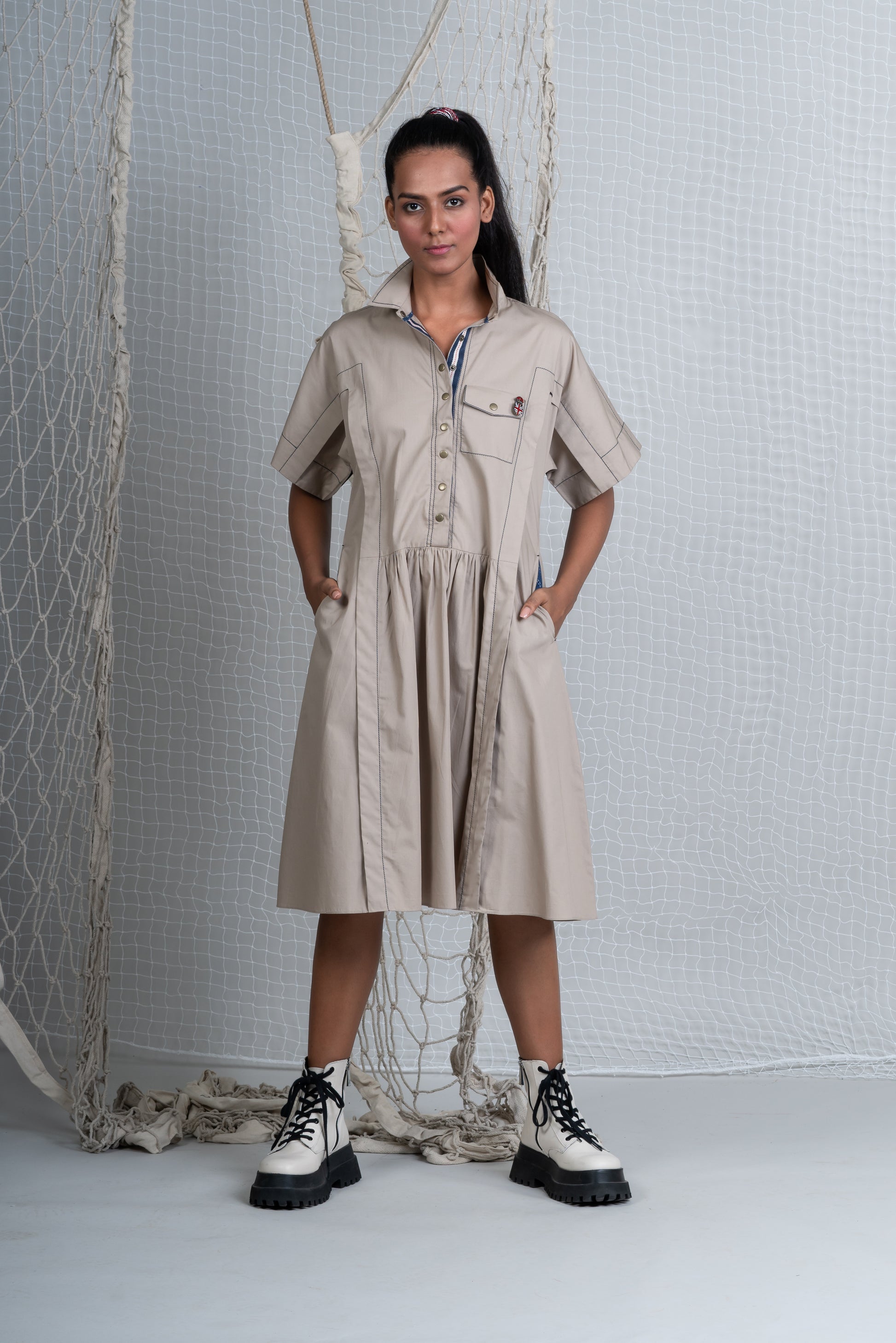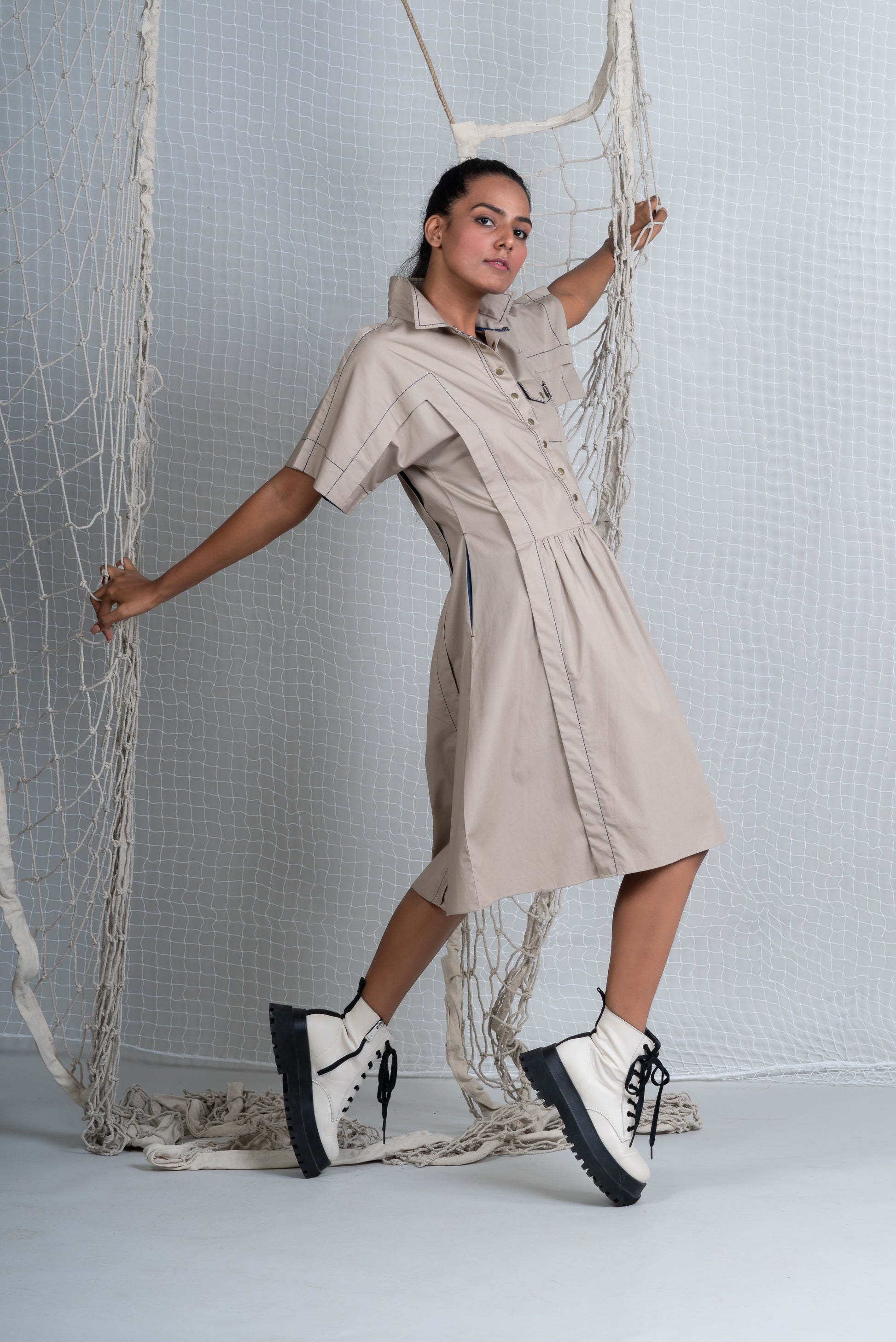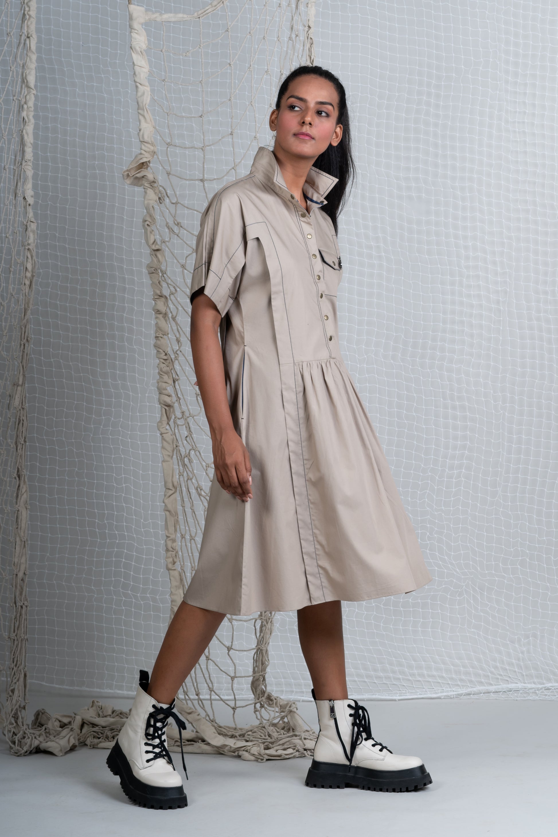Button down Utility Shirtdress in a dropped shoulder and relaxed A-line fit with micropleats along the gathered waistline, completed with double pockets and contrast stitch details