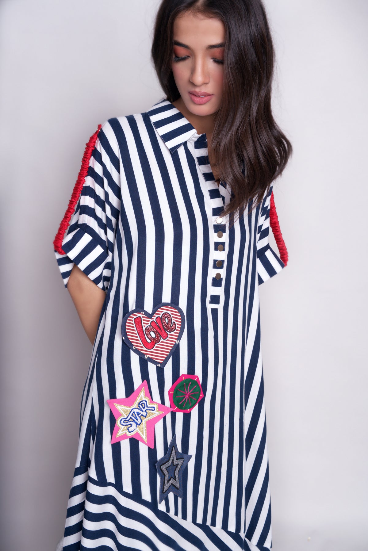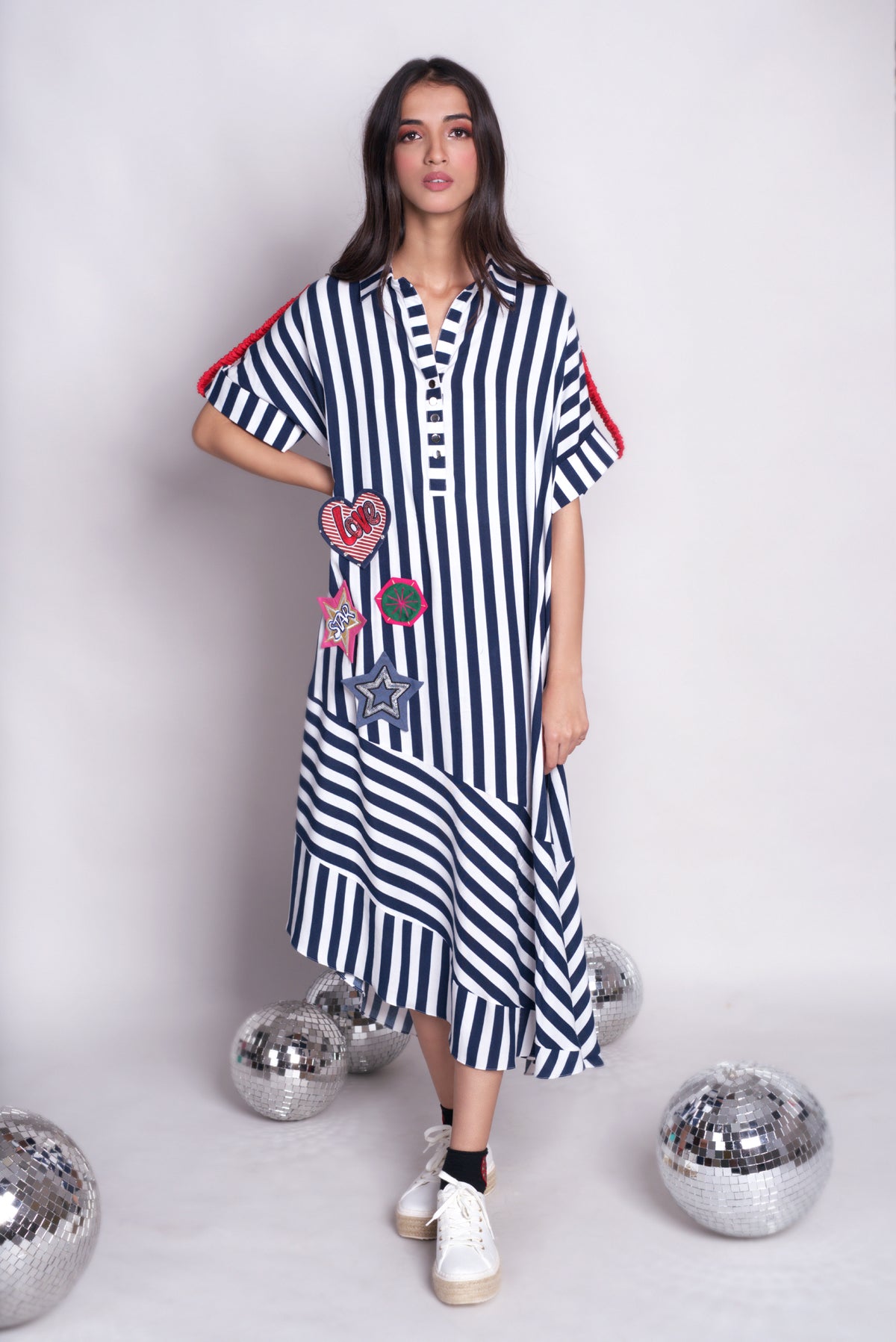 • Mid length kaftan tunic in large stripes with folded sleeves and ruched details