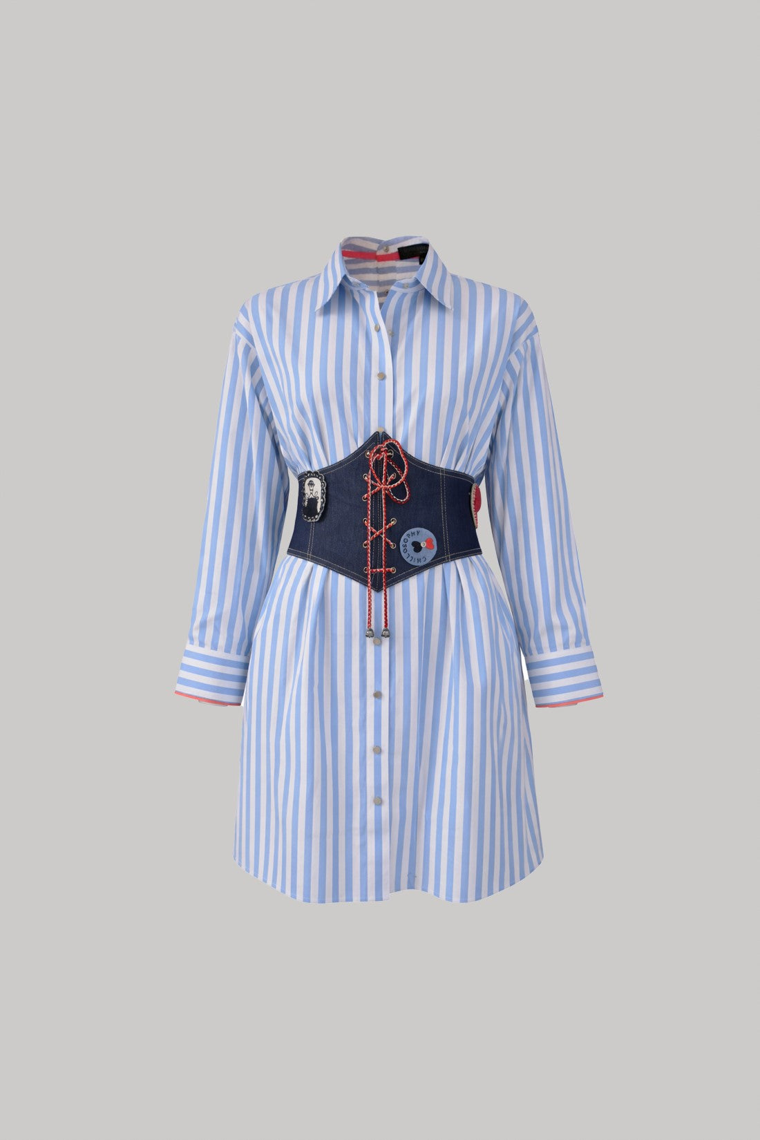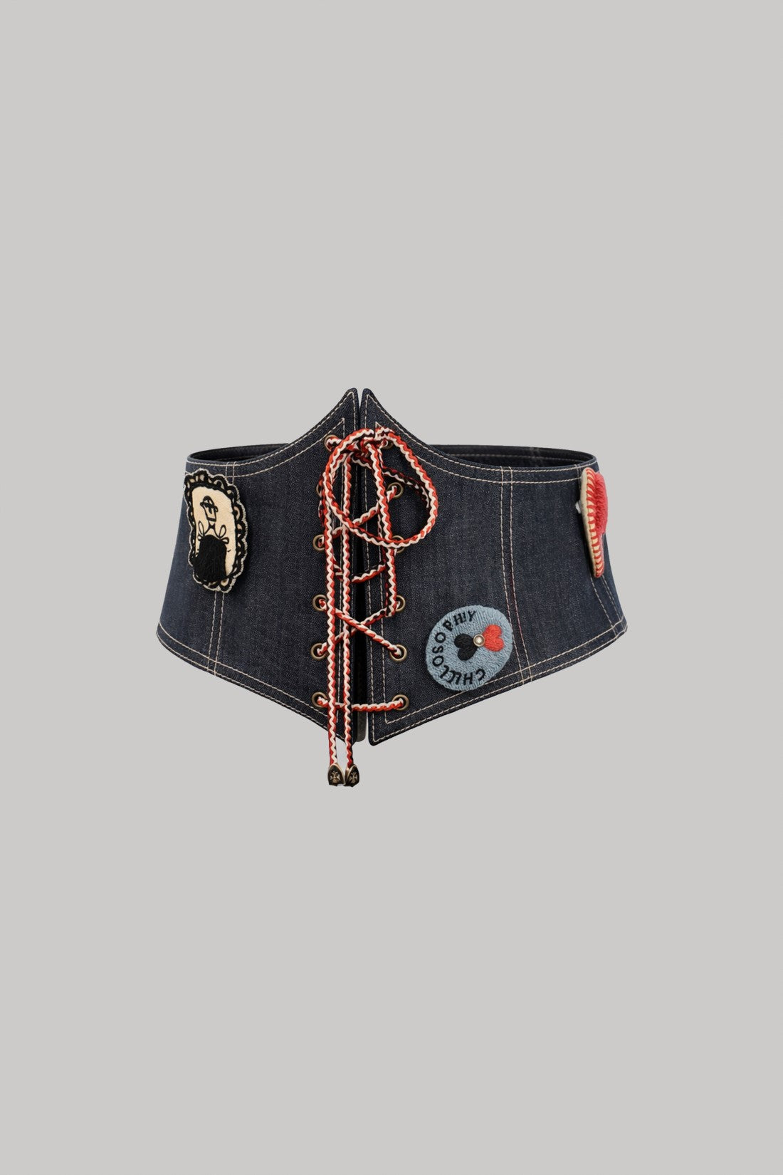 A statement denim corset belt designed to cinch the waist and elevate any outfit. Featuring a lace-up front with metal eyelets, playful embroidered patches, and a comfortable smocked back with zip closure for an easy fit. Perfect layered over oversized shirts or dresses for an effortless, structured look.