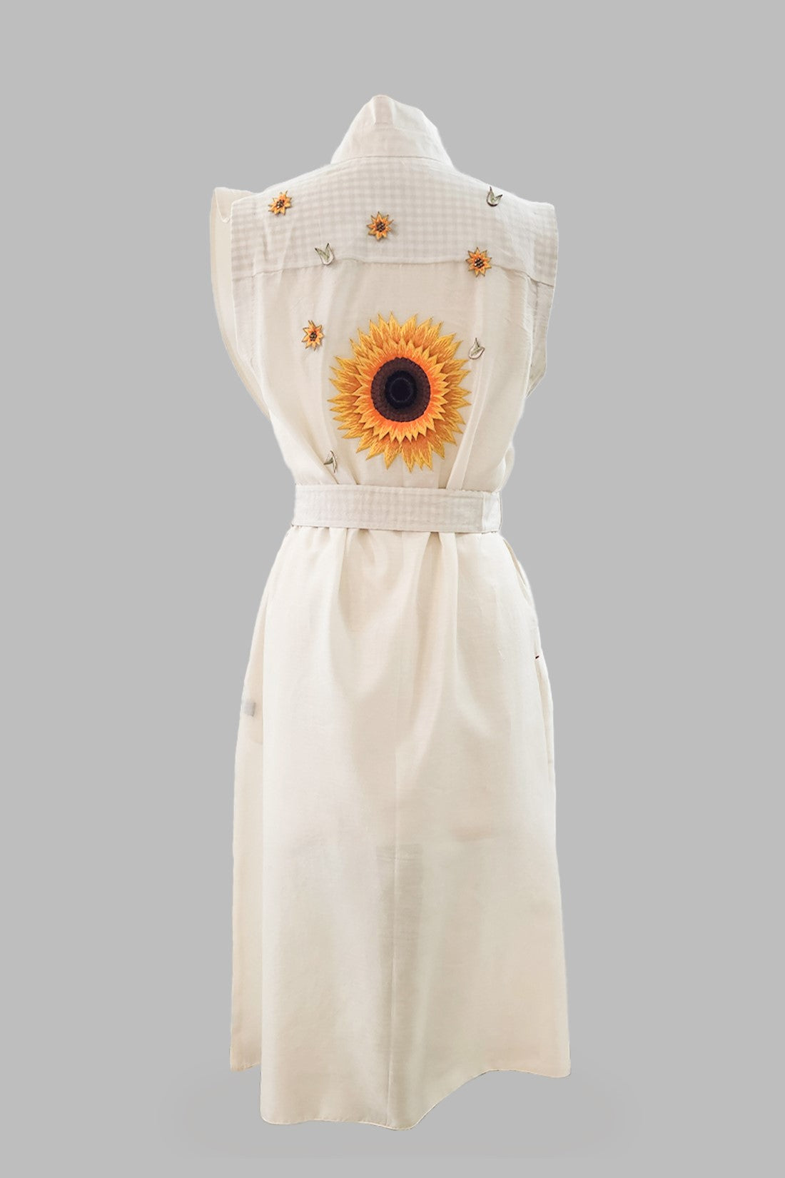 Our favourite dress is here to spread sunshine in the festivities. Long, sleeveless trench style dress in delicate fabric with oversized ruffle. This limited edition features a hand-embroidered sunflower patch to elevate your festive look.