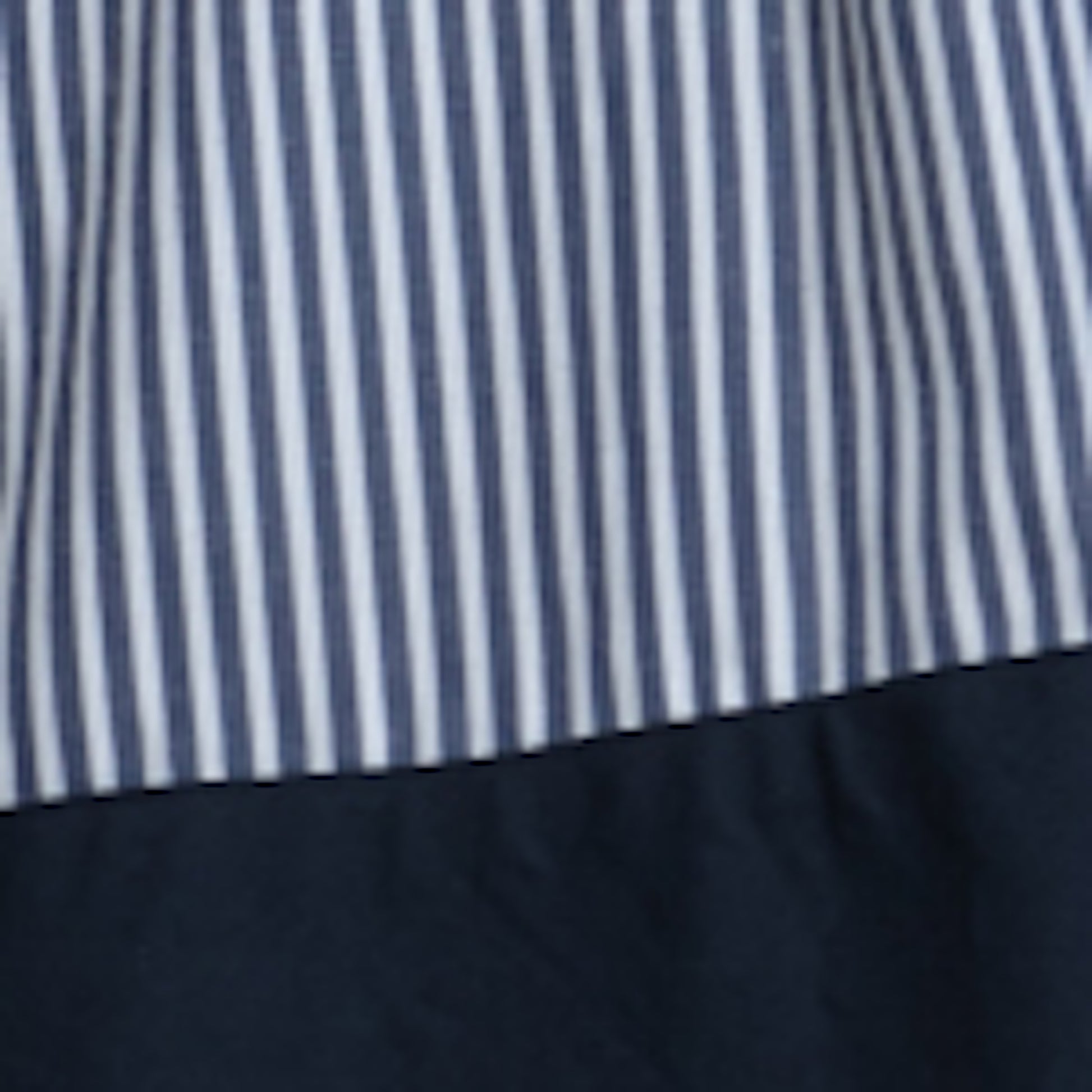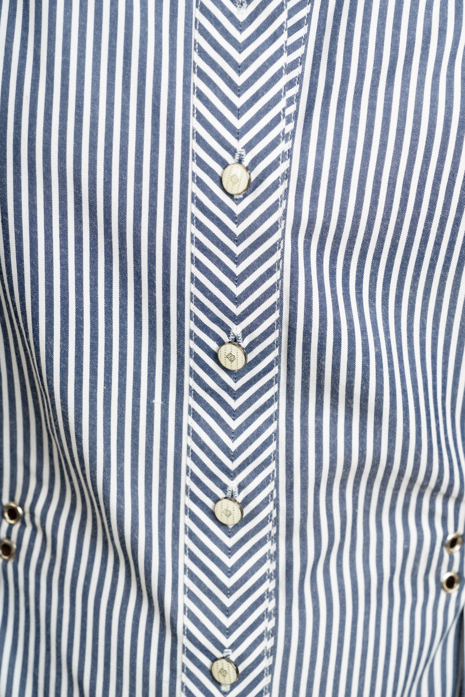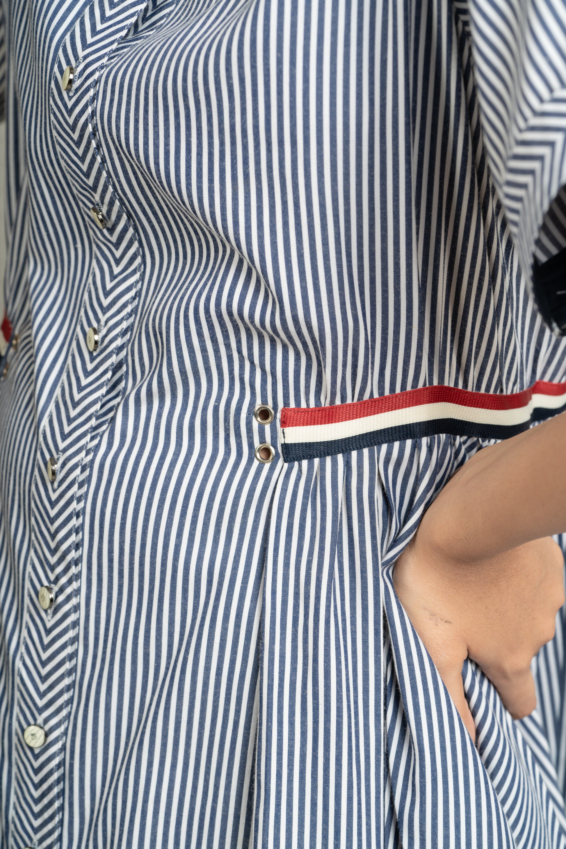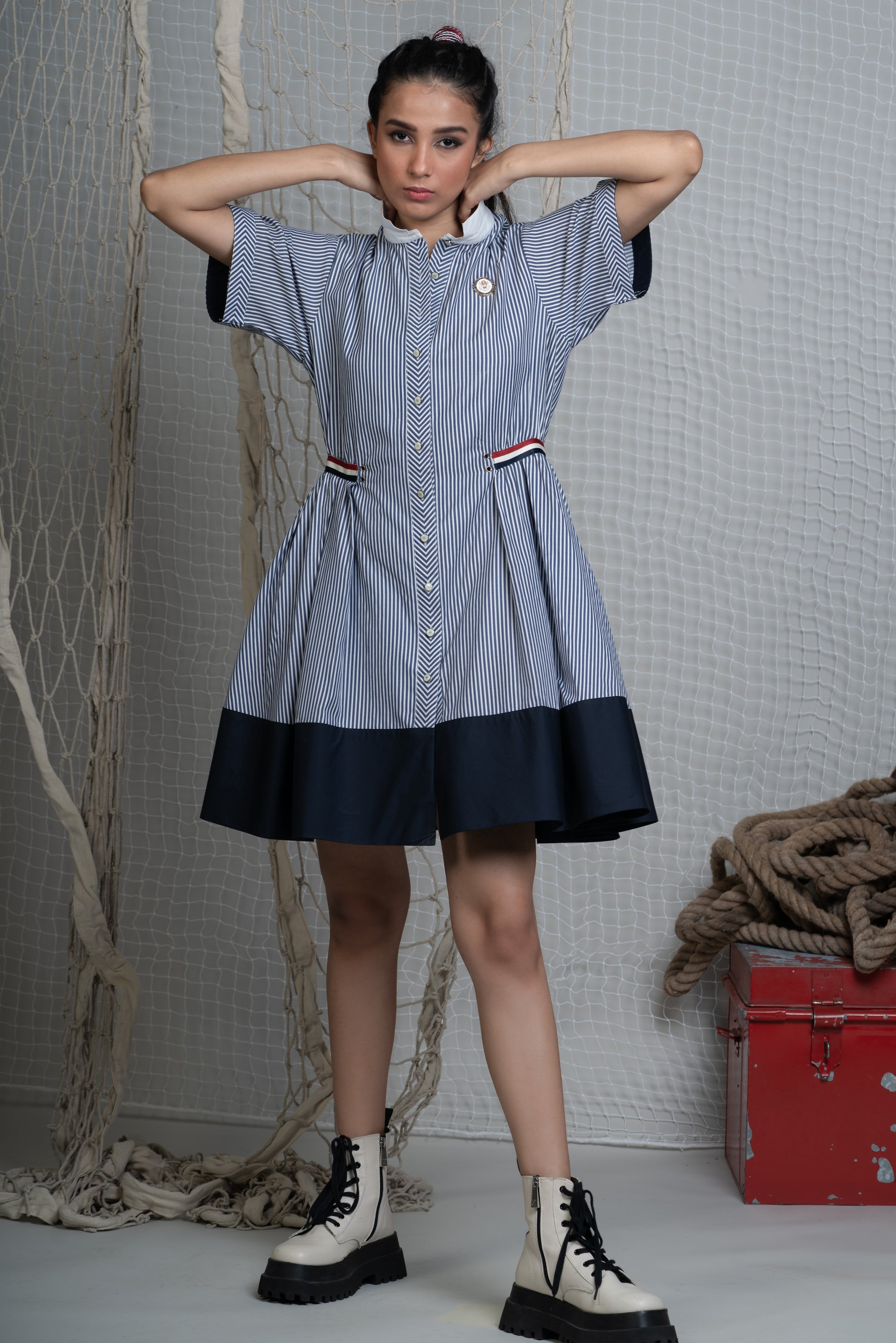 Button down flare swing dress in A-line fit in light and breathable striped Poplin with contrasting Navy Blue hem, classic stand collar with chevron detailing on the front completed with nautical stripe waistband to accentuate the wasitline