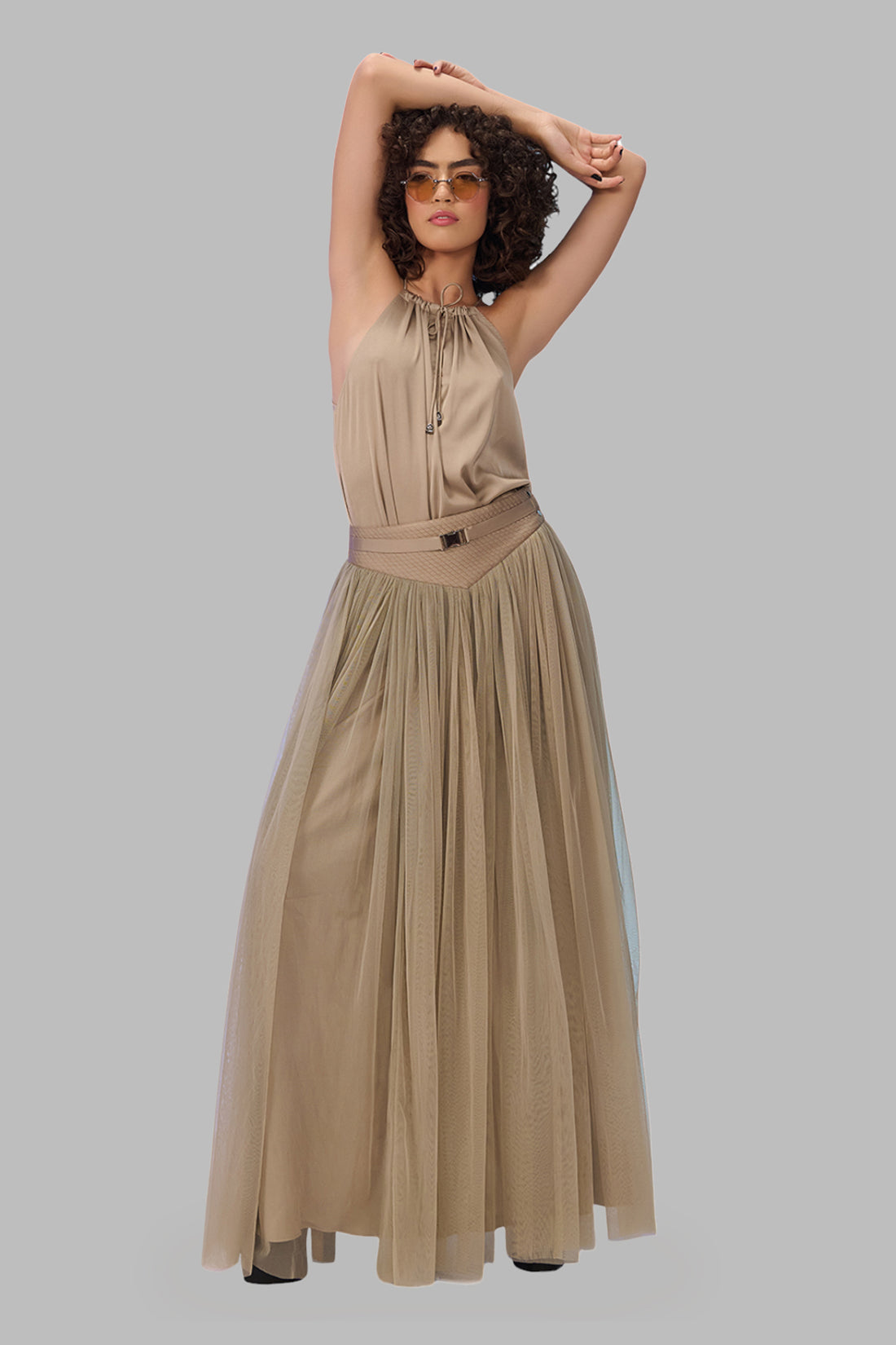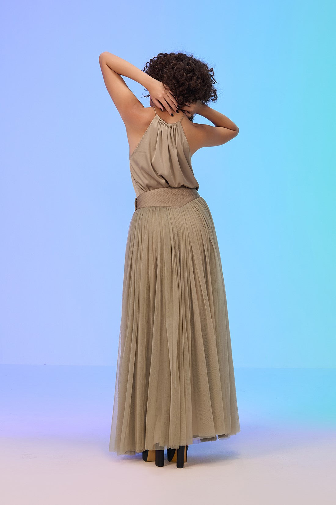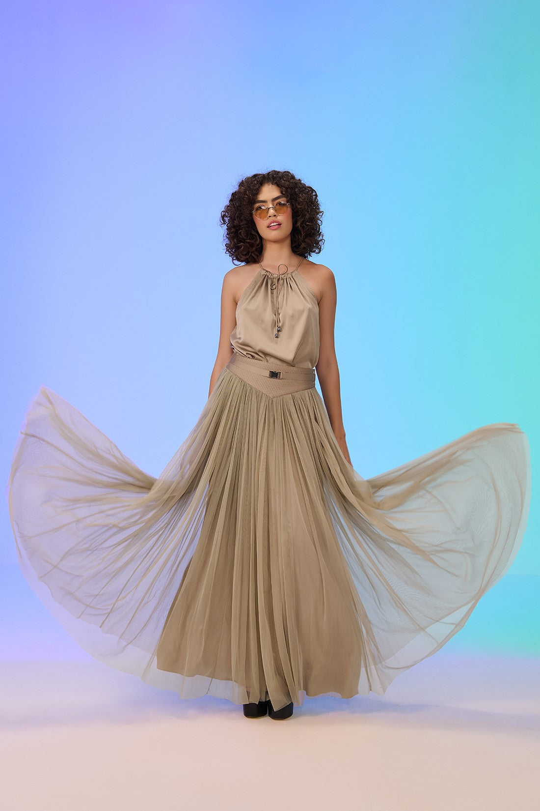 This flirty, long skirt with satin top oozes elegance. With dainty details like the quilted waist belt and thin strappy neckline is epitome of our approach to minimalistic opulence.