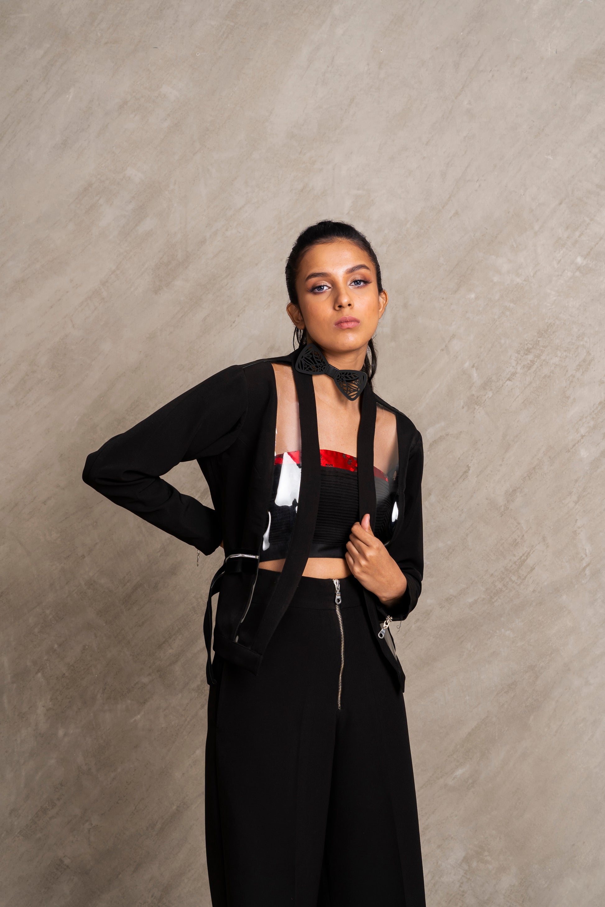 Game up your style quotient with our stylish cut blazer jacket featuring PVC details on the lapels and the back, elastic belt with metal loops on the side for perfect fit and metal zippers on the end sleeves. This jacket is tailored with Jacquard lining with lion print motifs to unleash your rebel within.
