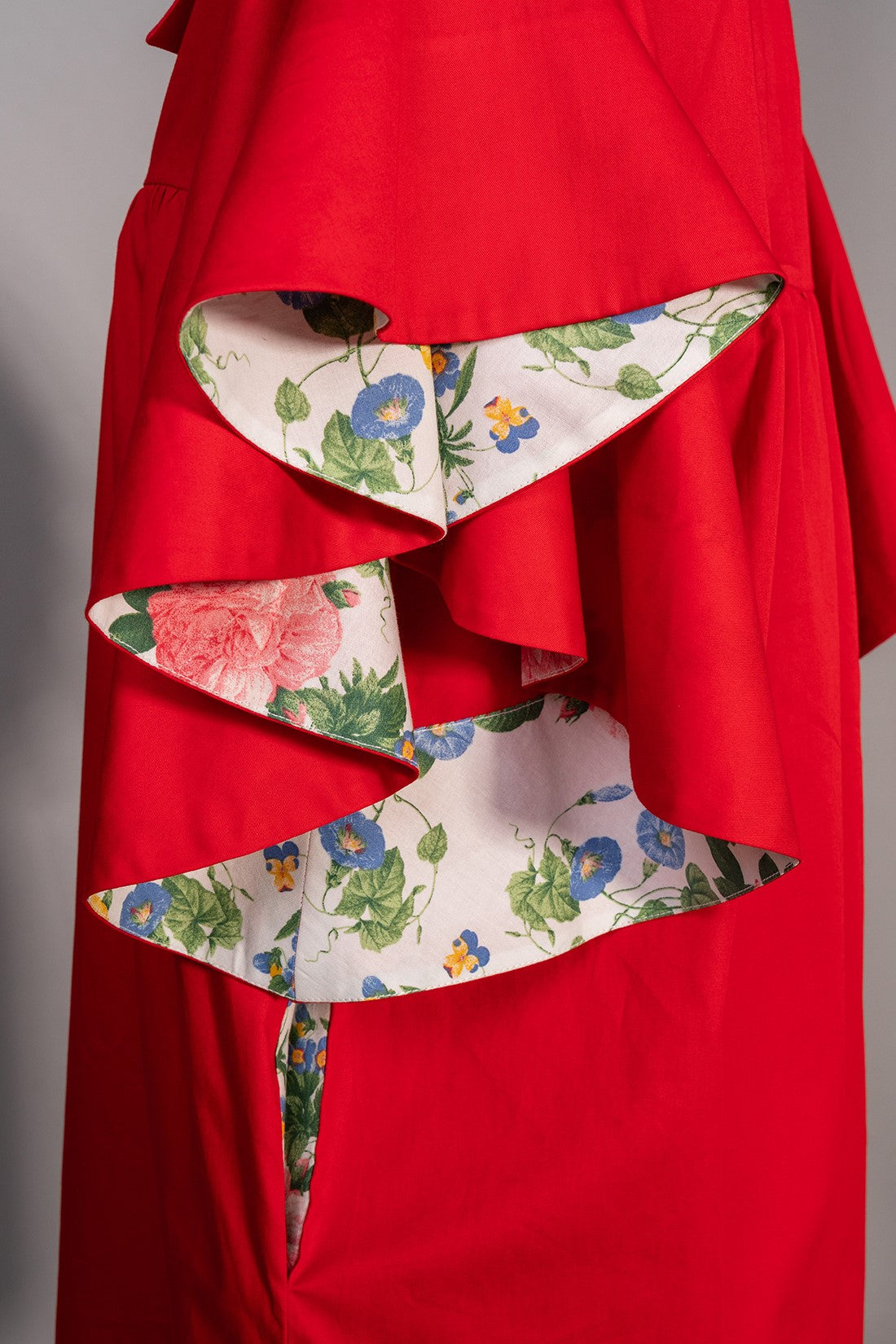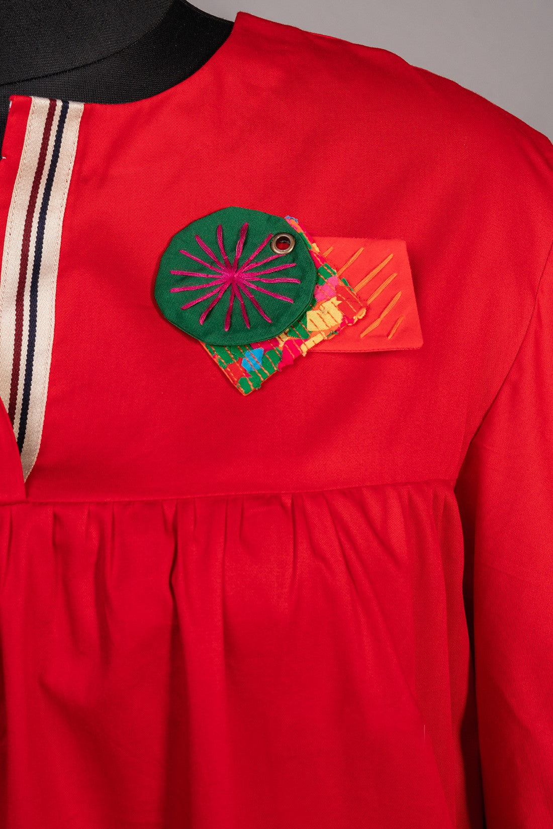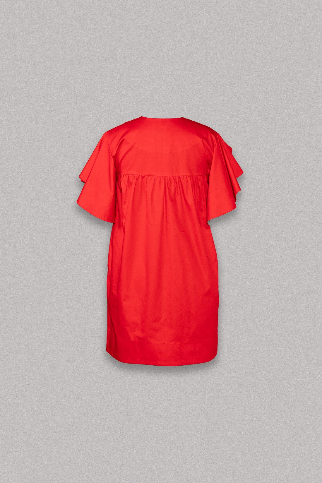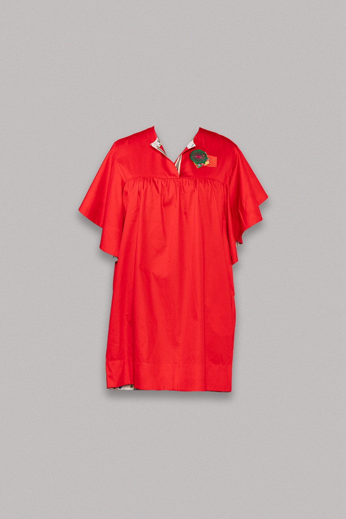 Stunning red, this short, flowy dress has generous side pockets, handmade Confetti details, and flared sleeves. Feel free to be.