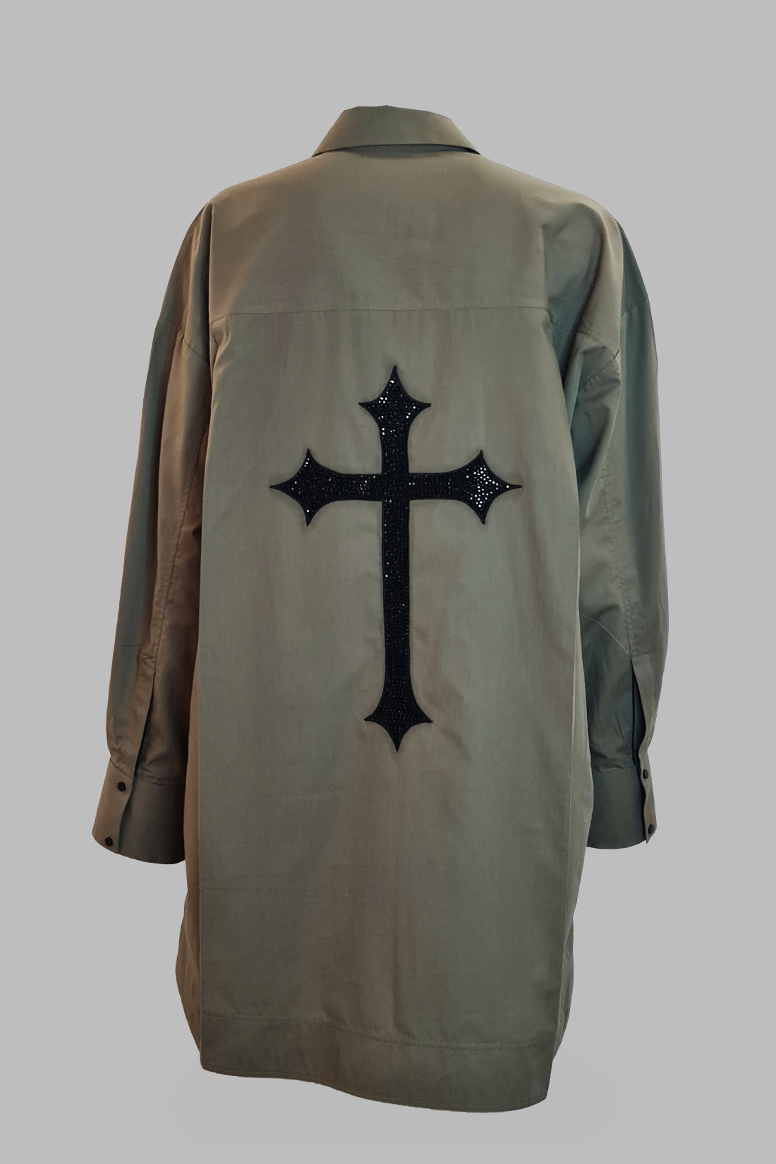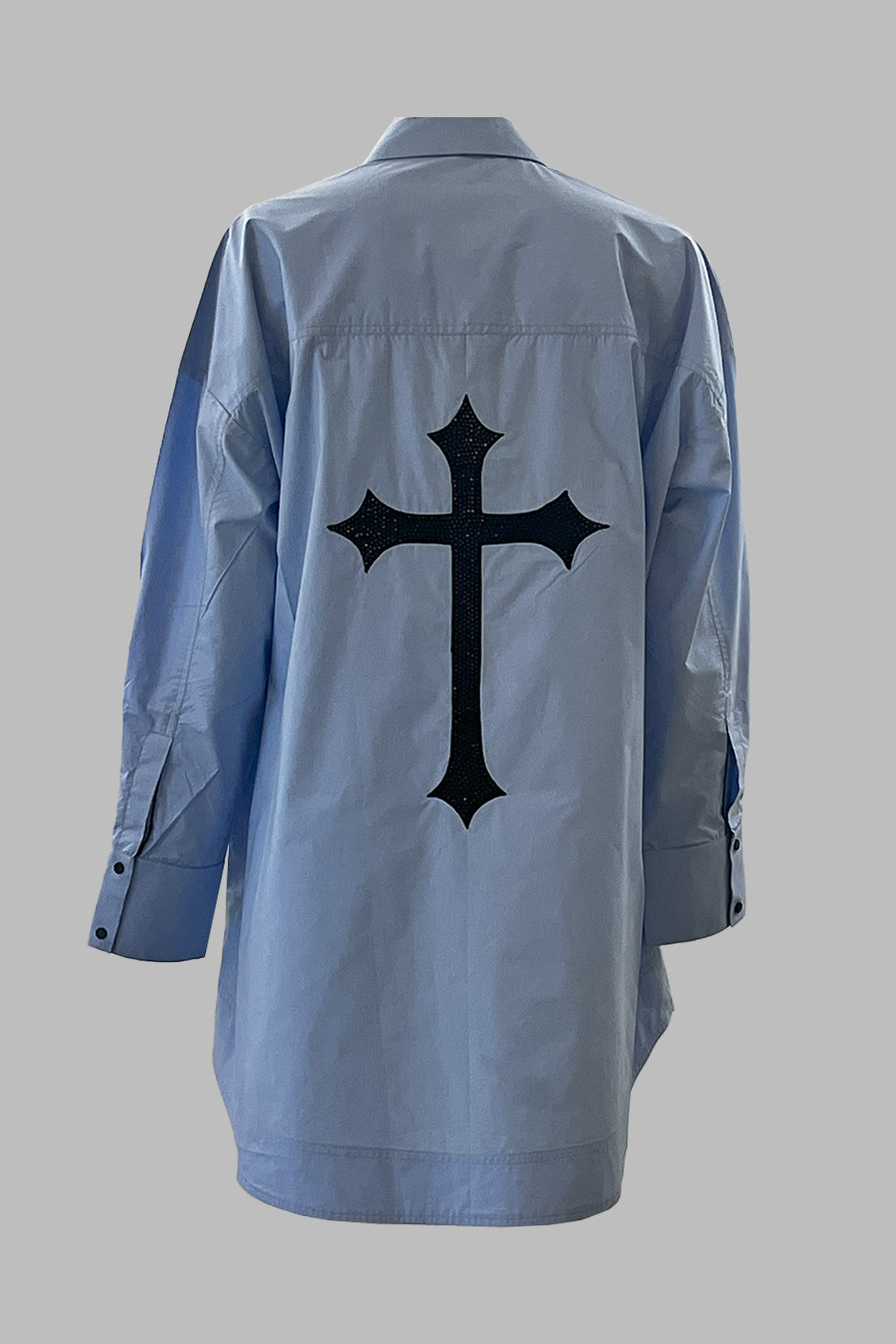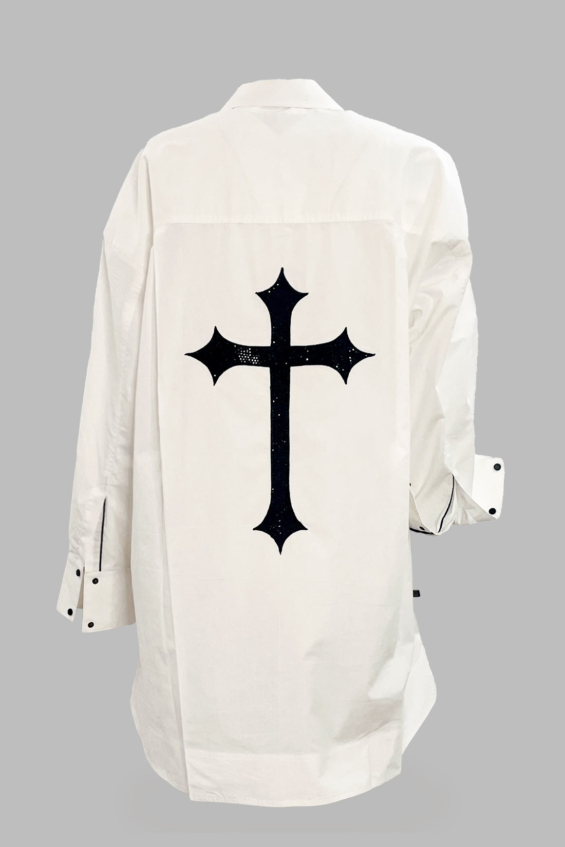 This bold shirt dress is sure to elevate your ‘go-getter’ instinct. With a bold cross embroidery patch at the back, adorned with rhinestones, this dress is a showstopper.