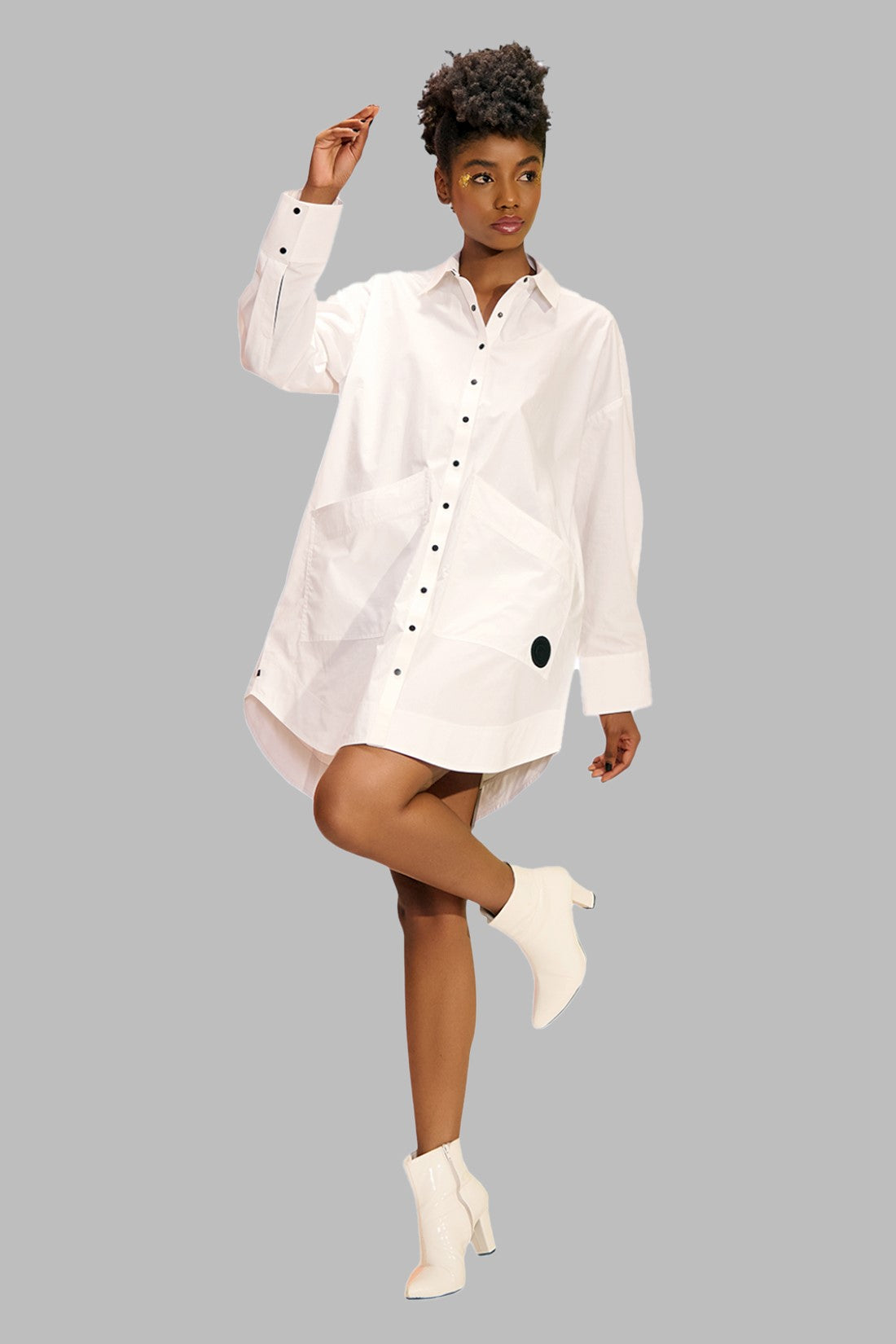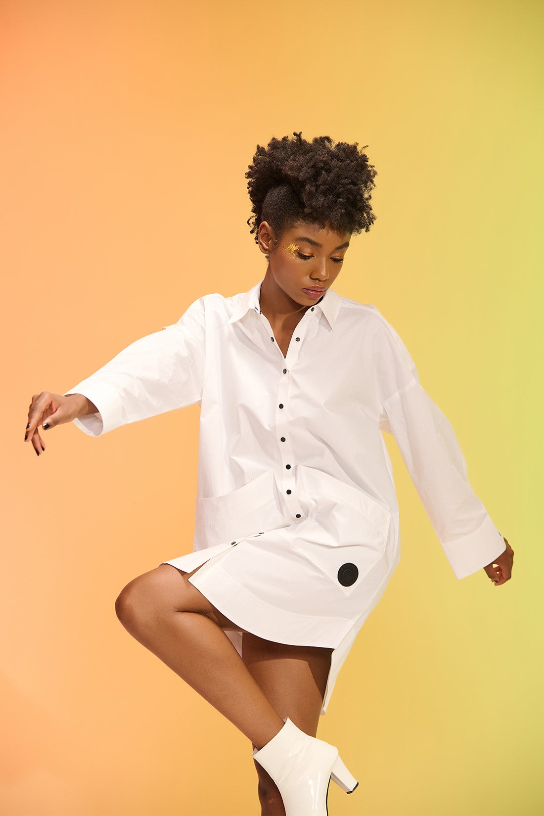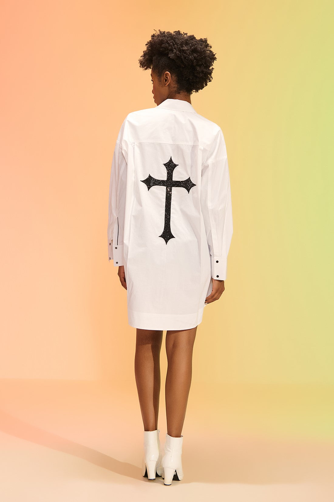 This bold shirt dress is sure to elevate your ‘go-getter’ instinct. With a bold cross embroidery patch at the back, adorned with rhinestones, this dress is a showstopper.
