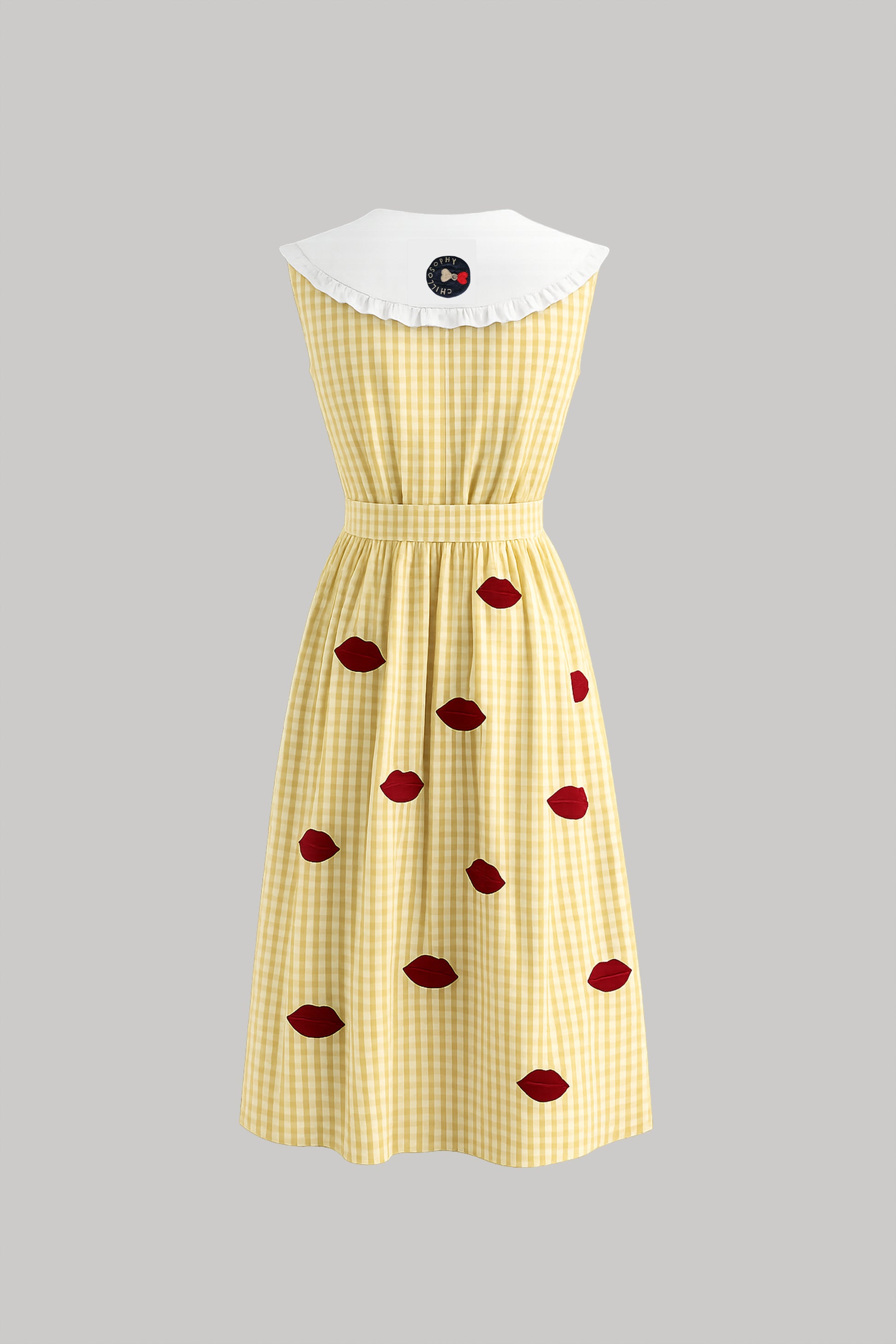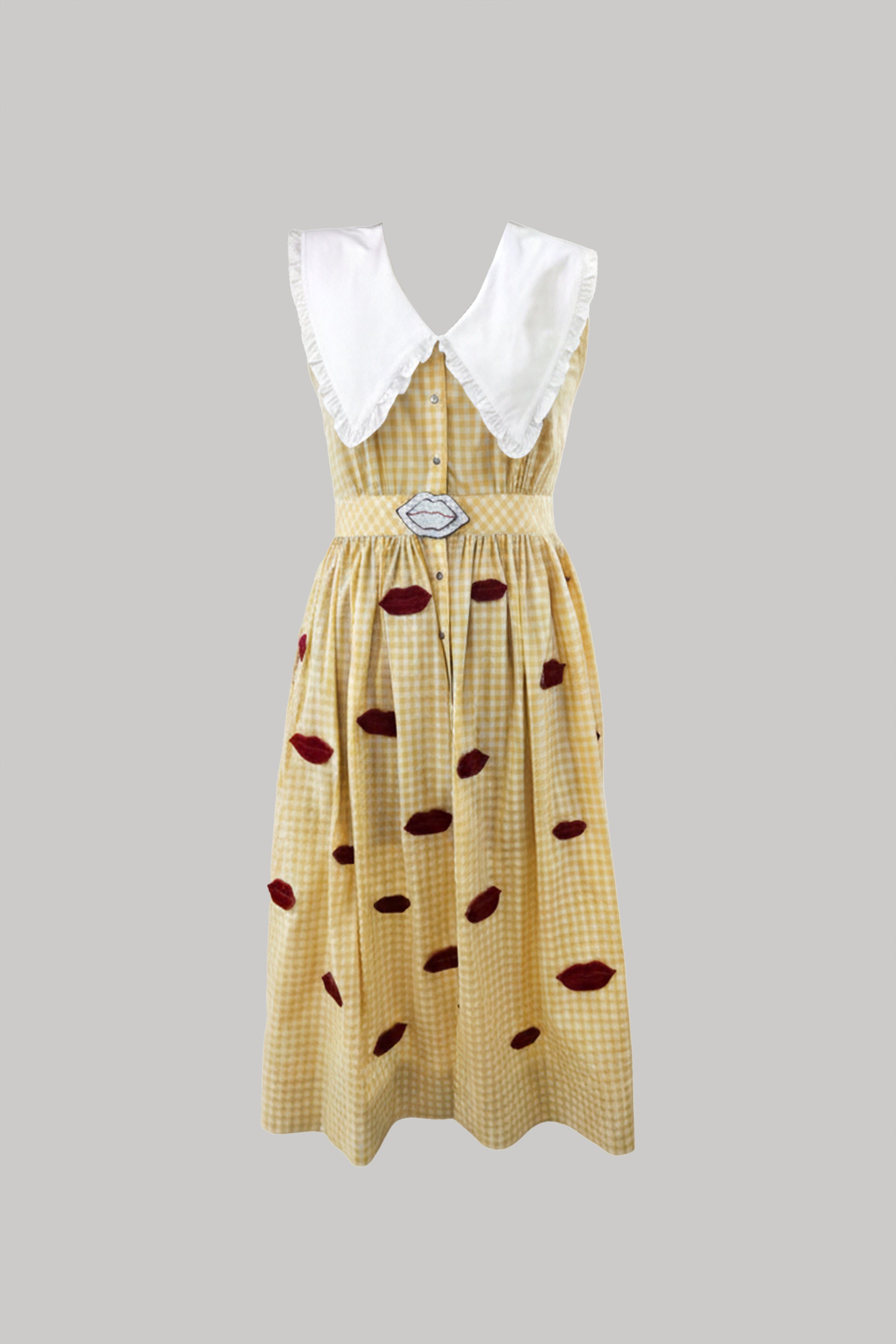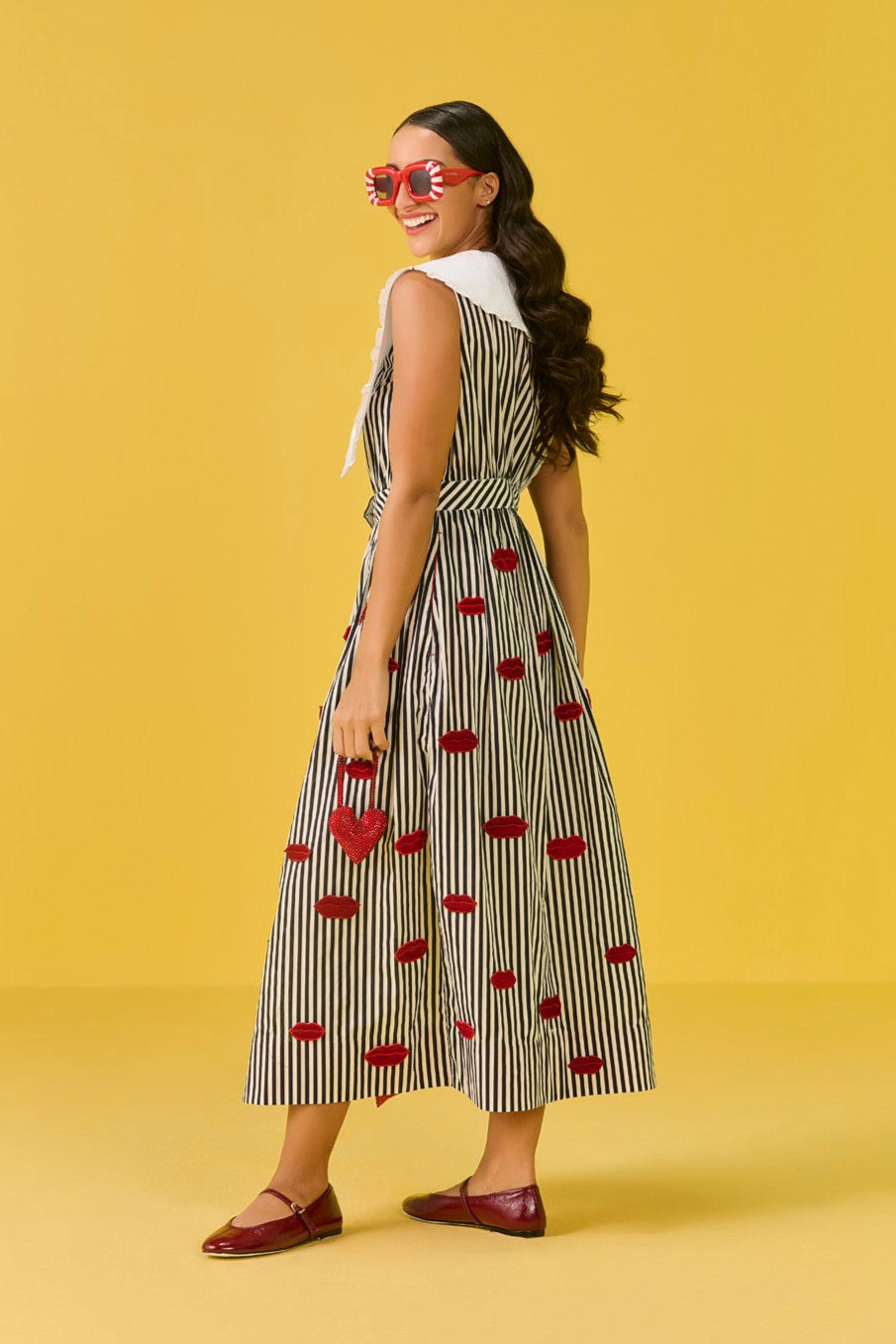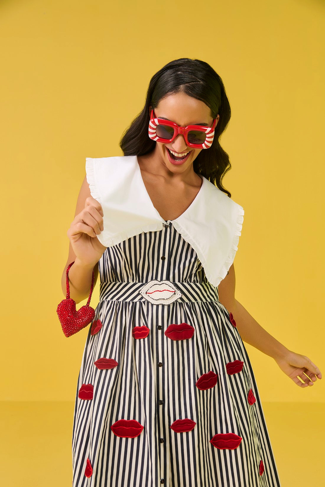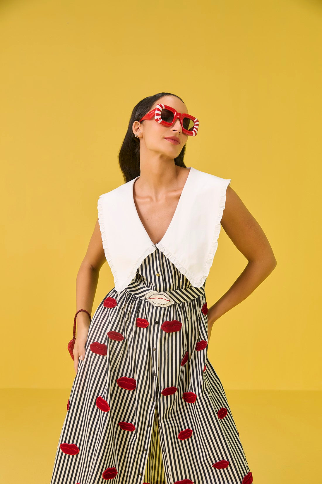 A full-length A-line dress with a structured yet flowing skirt that gives vintage vibes. The dress features a structured bodice anchored by a bold pilgrim-style collar- wide and rendered in crisp white for a sharp contrast against the main striped fabric. The dress is adorned with quirky 3D lip patches scattered around the skirt area and a rhinestone studded lip that holds the focus of the garment.