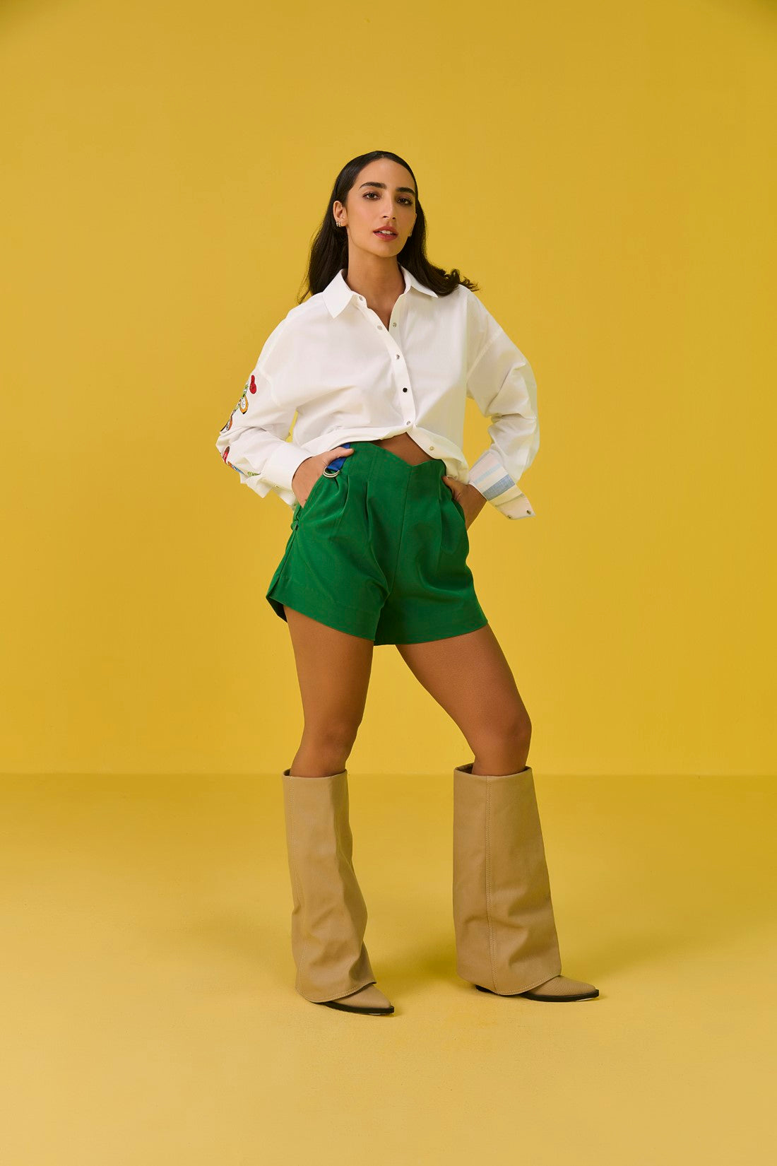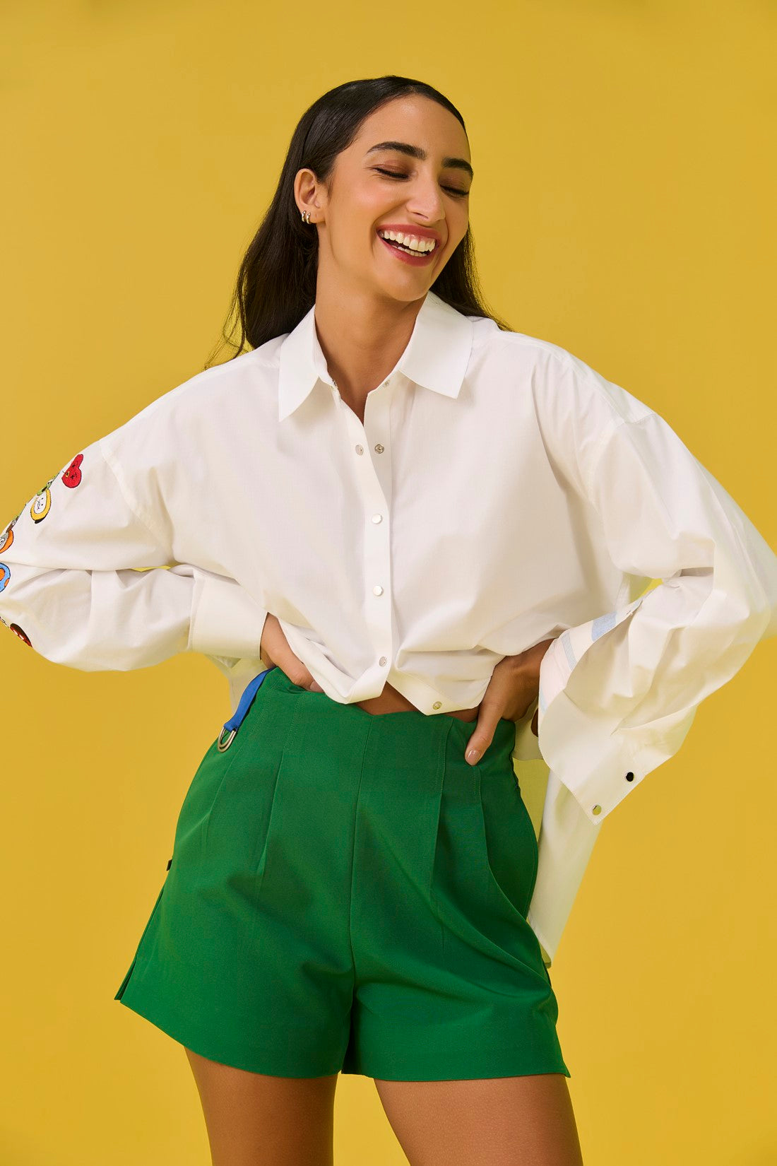 These high waisted shorts offer an elegant and breezy alternative to traditional bottoms. Made from thick crepe, they drape beautifully for a flattering silhouette that highlights the waist. Pair them with our Tickle shirt to complete your smart look.