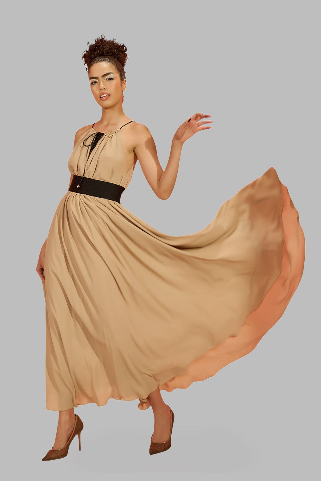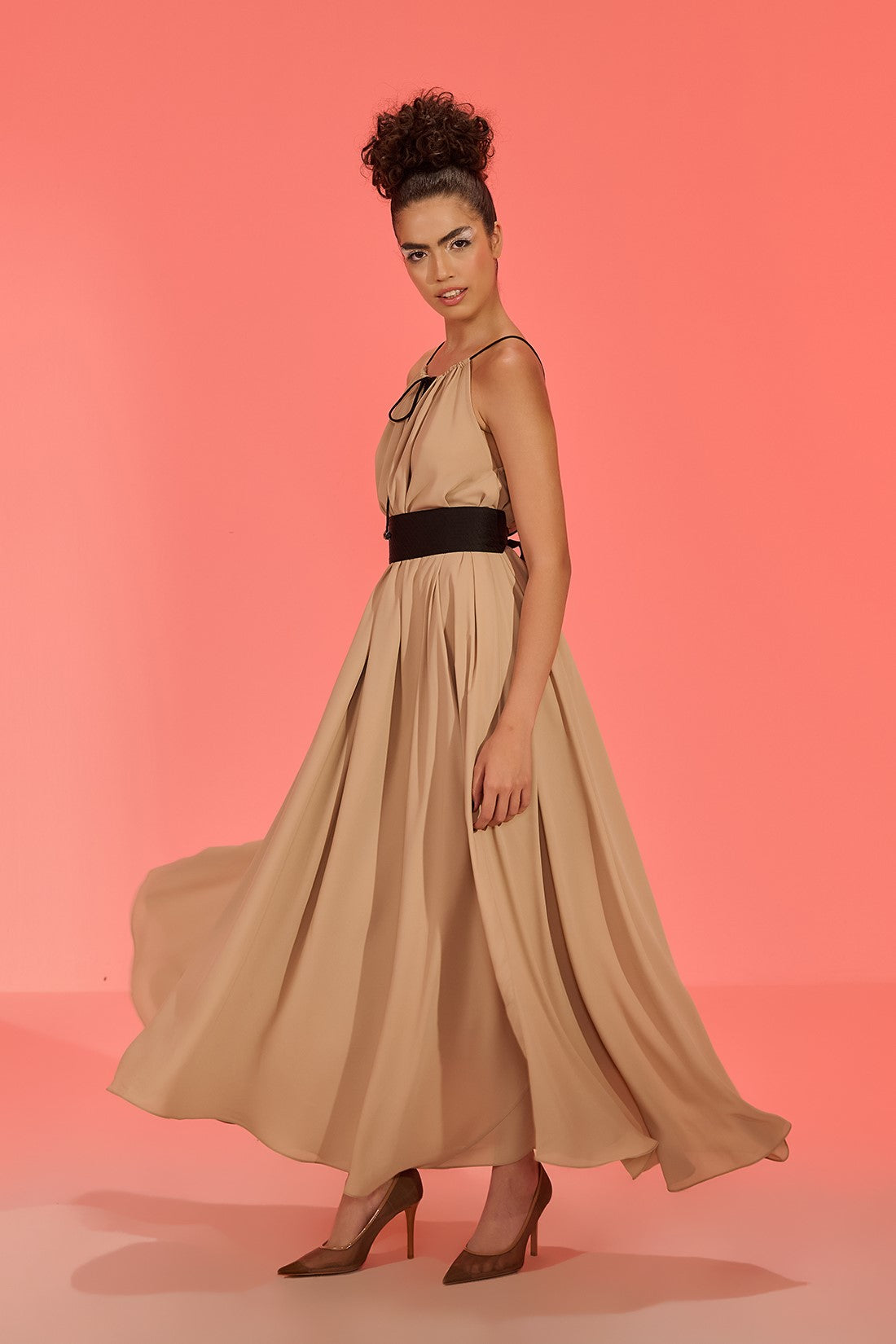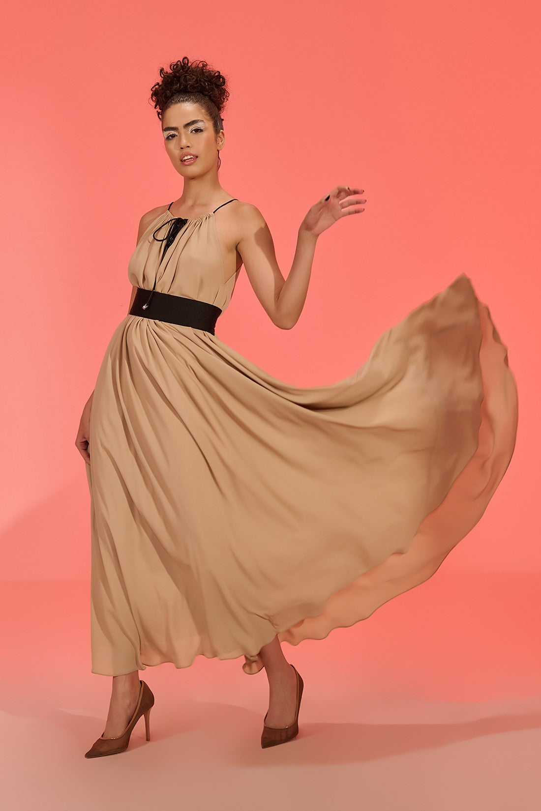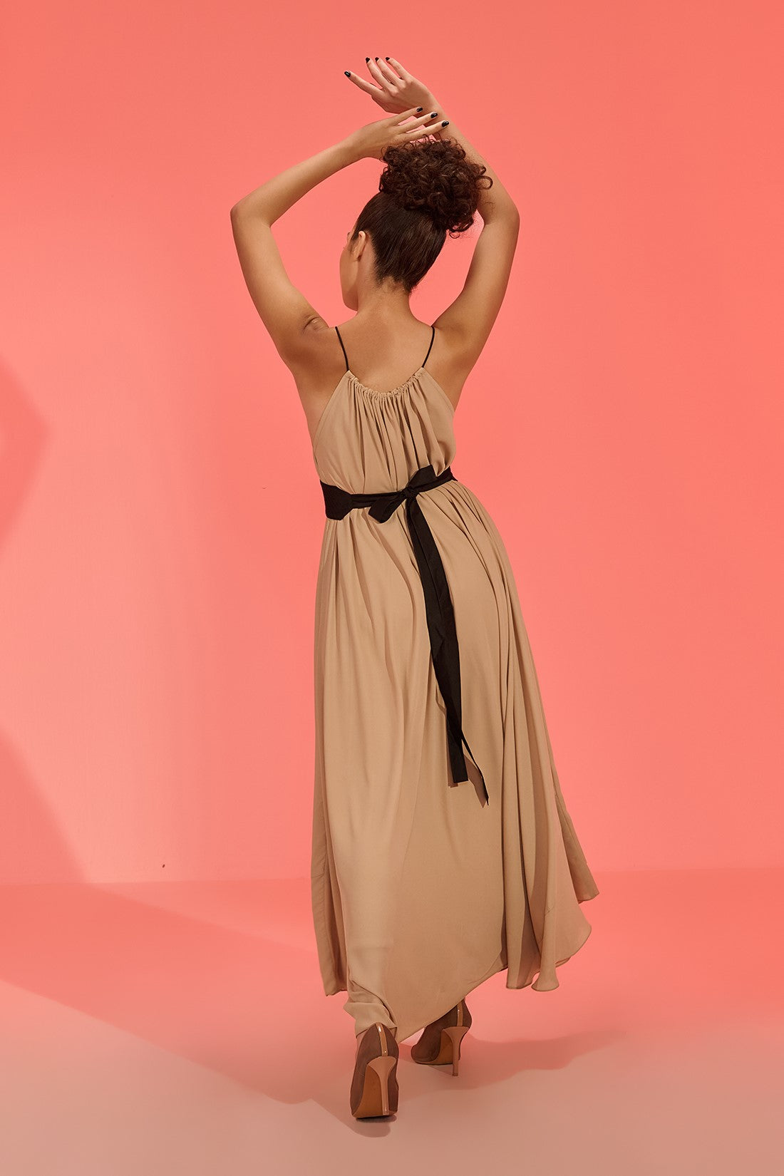 A sultry dress for the true rock and roll queen. This flowy, mid-calf length dress is sure to elevate up your mood and persona. The satin top is subtly embellished with high quality rhinestones.