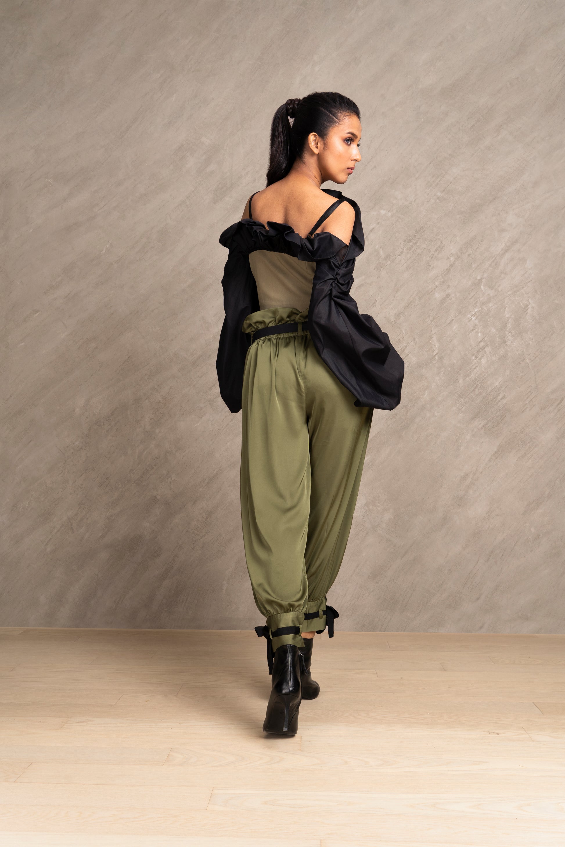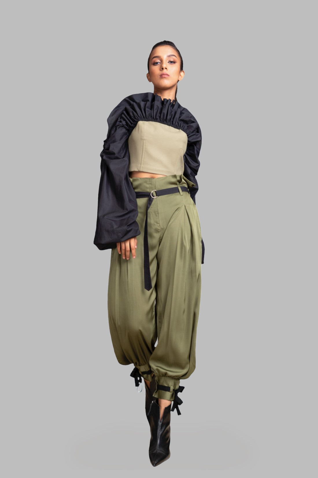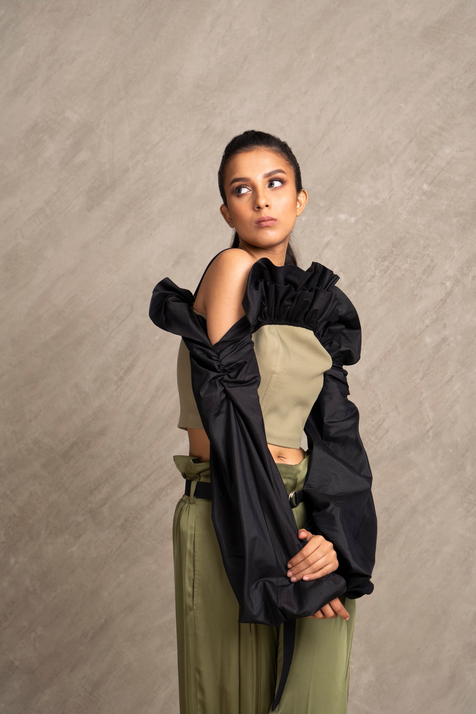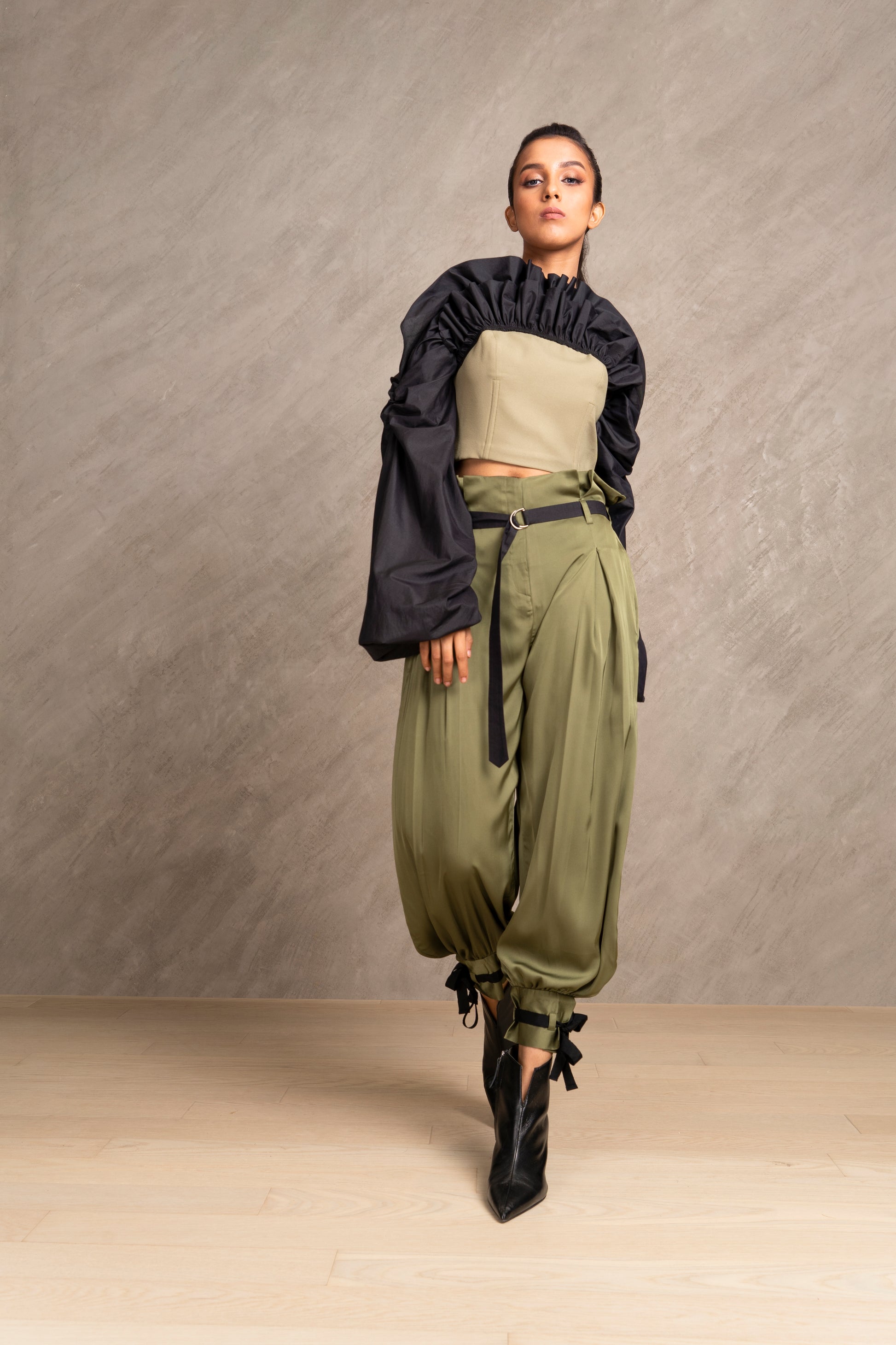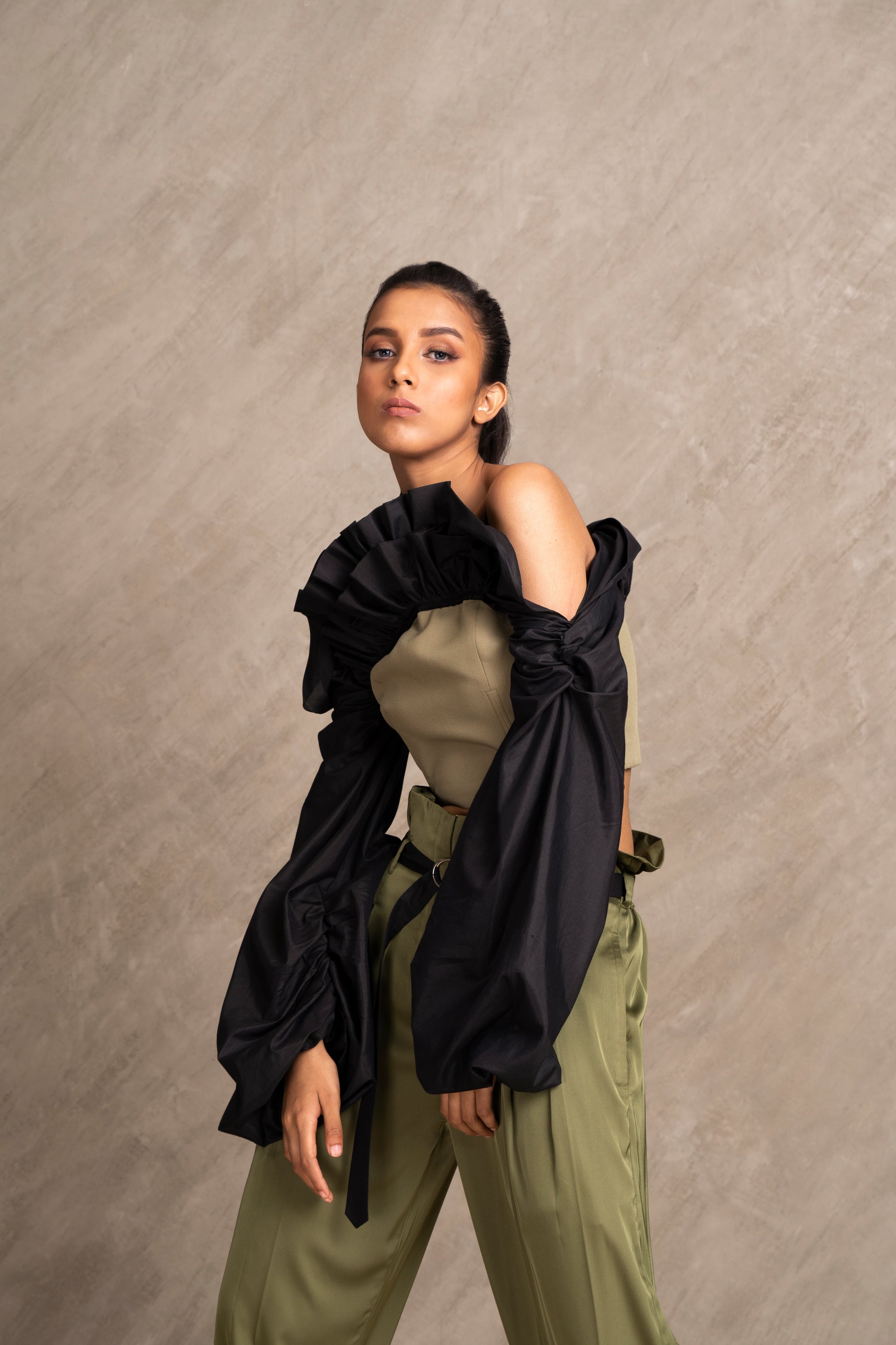 Seriously chic double layered corset top stitched with black cotton silk ruffles and long sleeves. Pair it with XENA Pants for the complete outfit