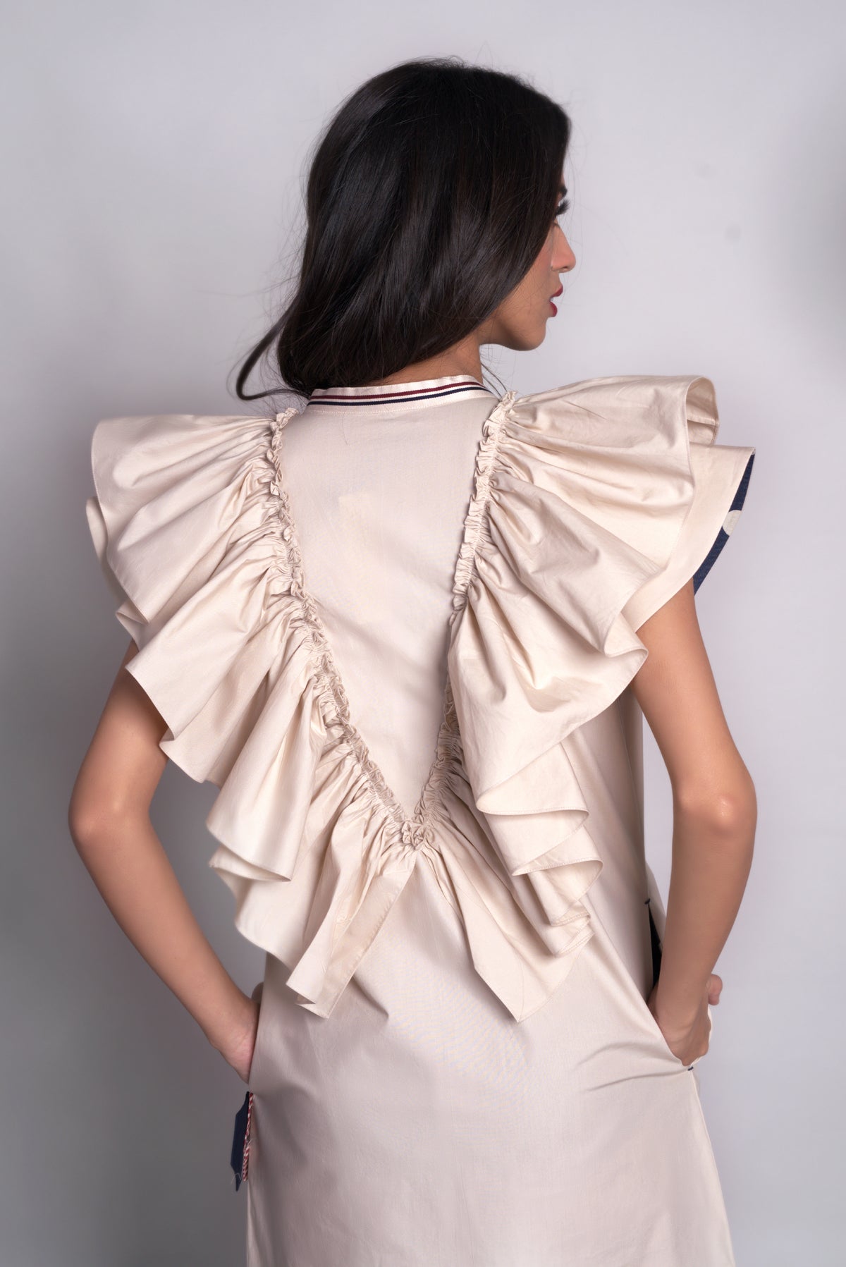 • Relaxed fit mini dress with oversized ruffle along the neckline