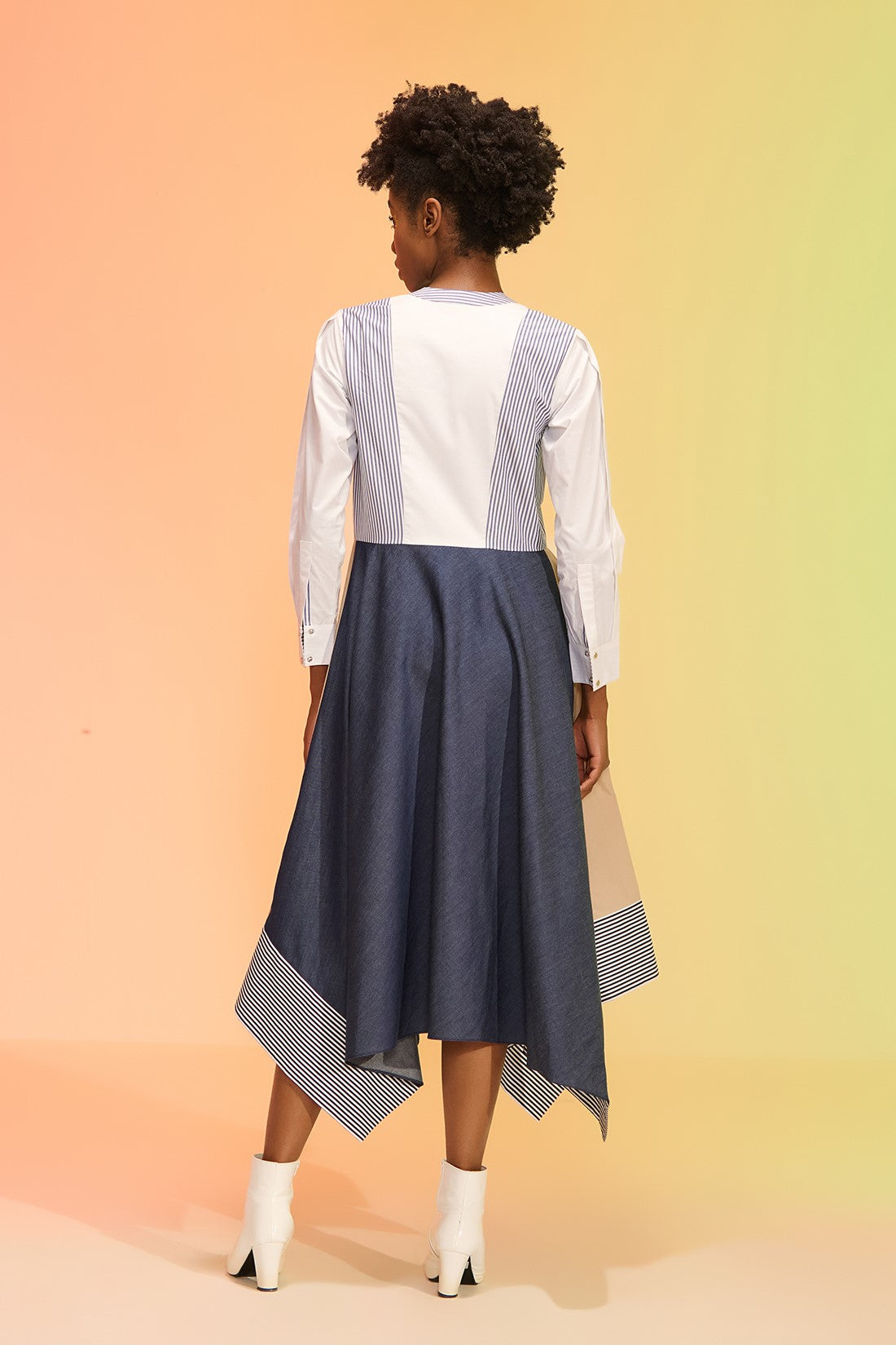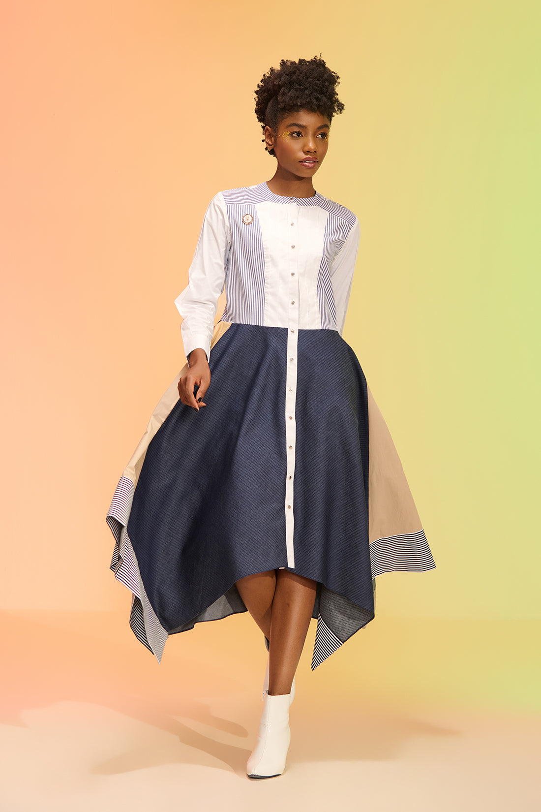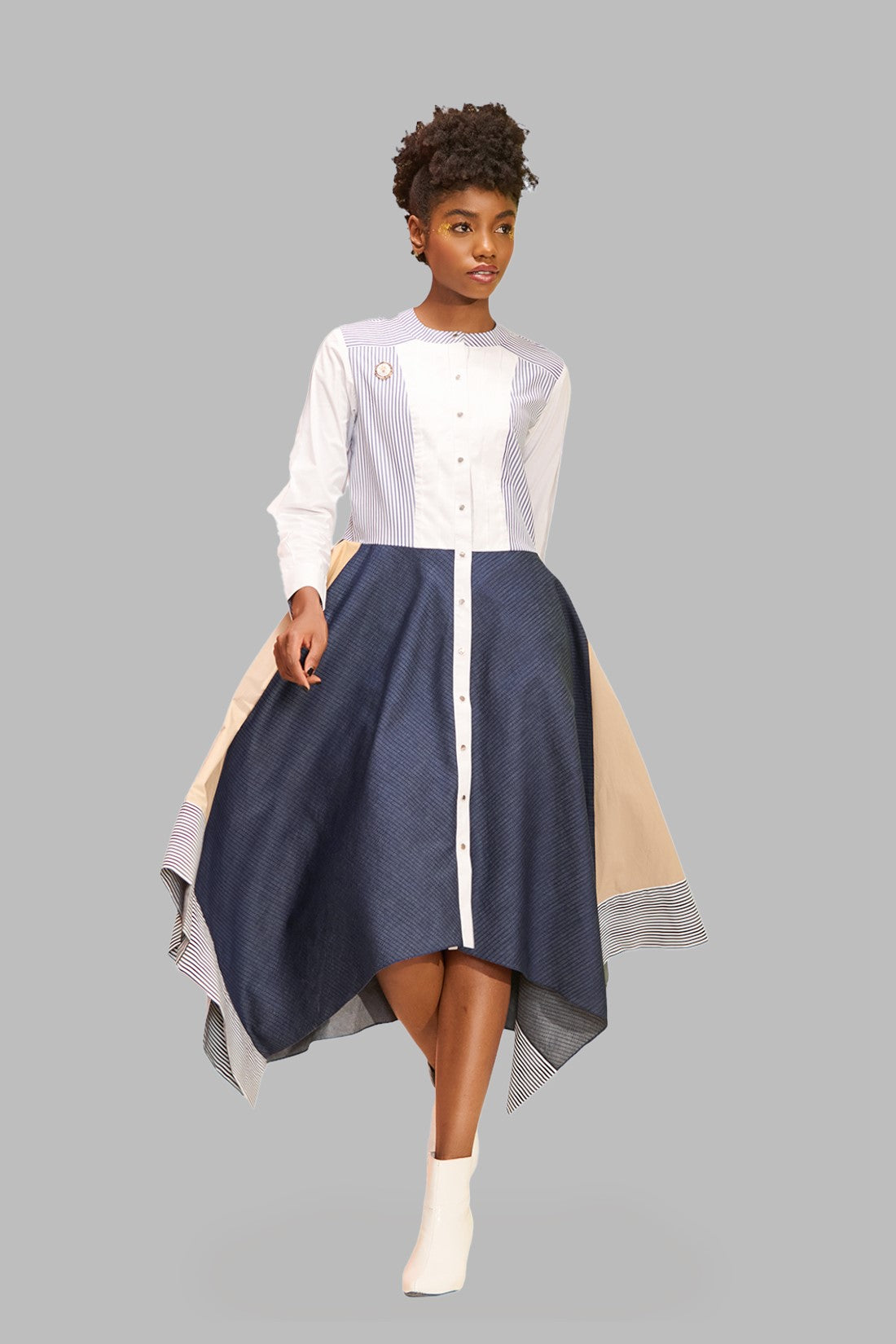 A calf length dress with asymmetrical hemline. An effortlessly stylish dress that uses juxtaposition of multiple fabric in various prints and textures.