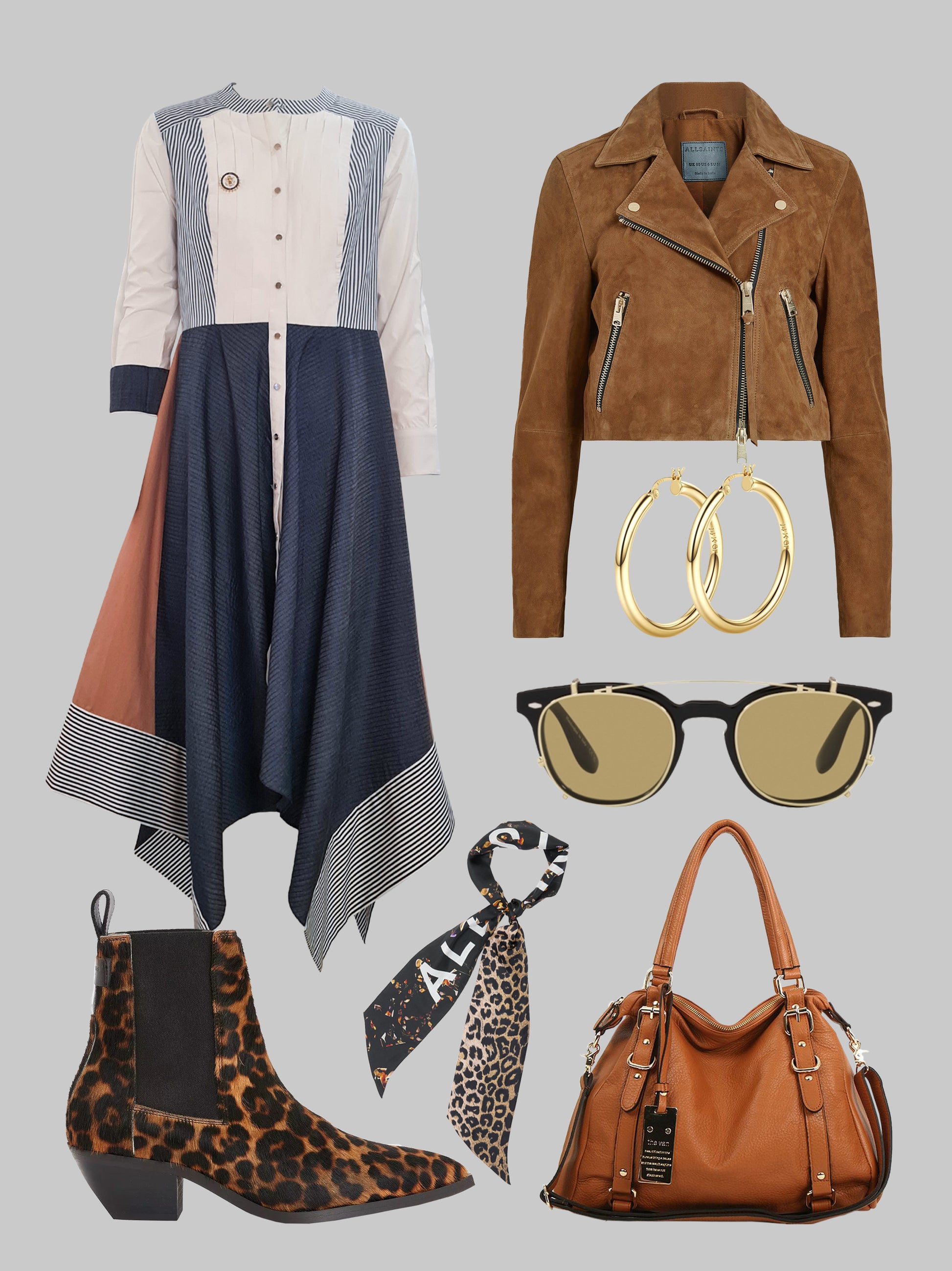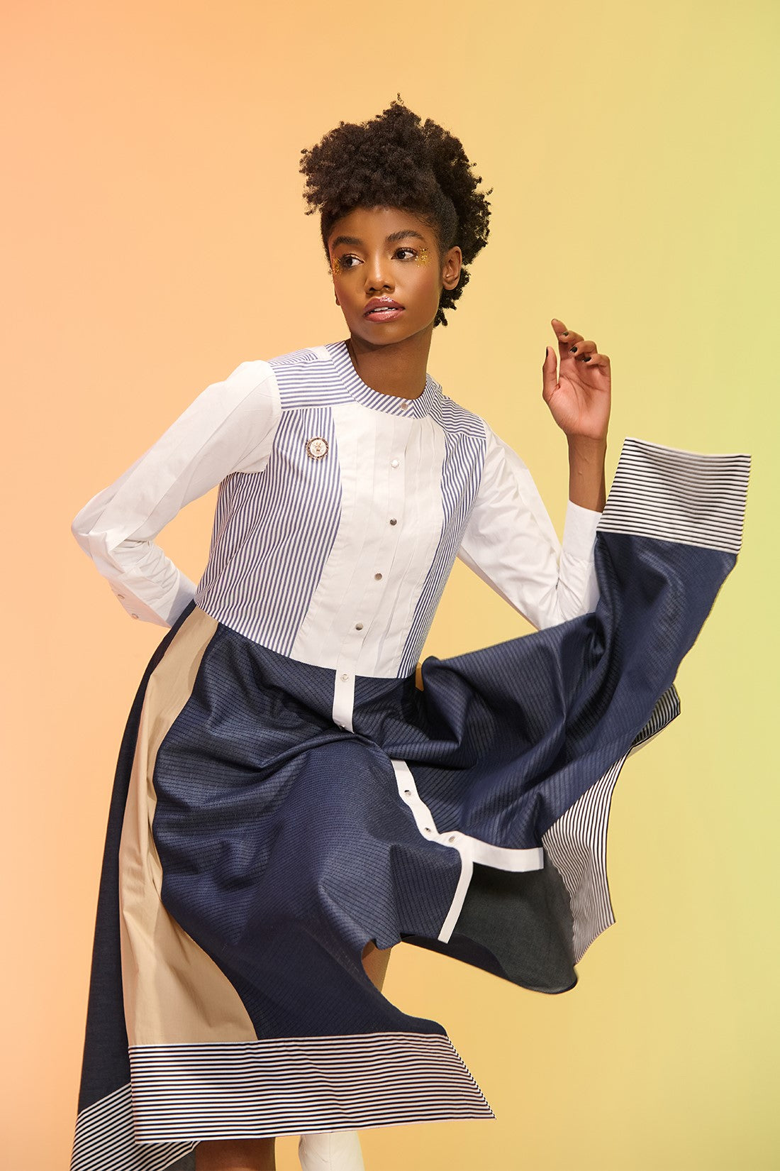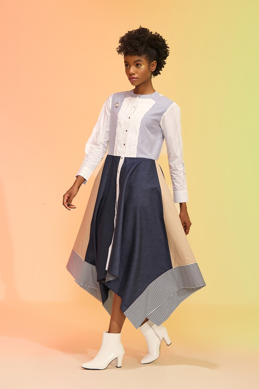 A calf length dress with asymmetrical hemline. An effortlessly stylish dress that uses juxtaposition of multiple fabric in various prints and textures.