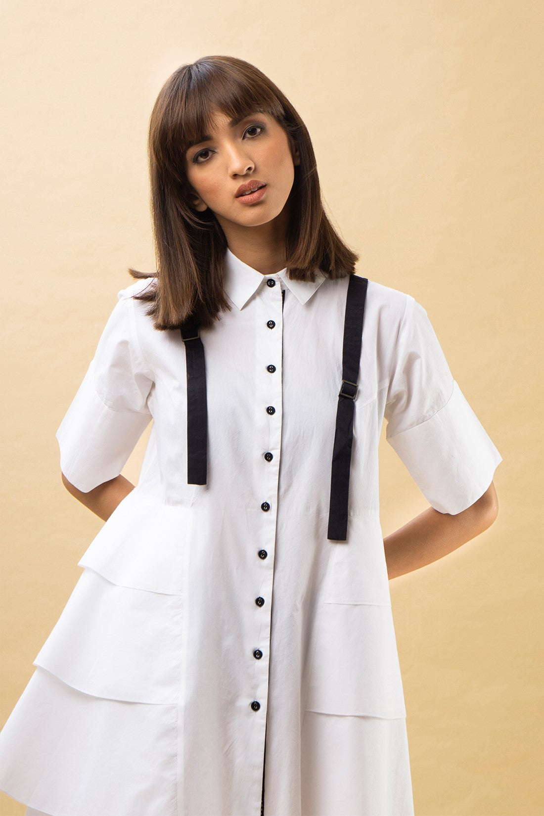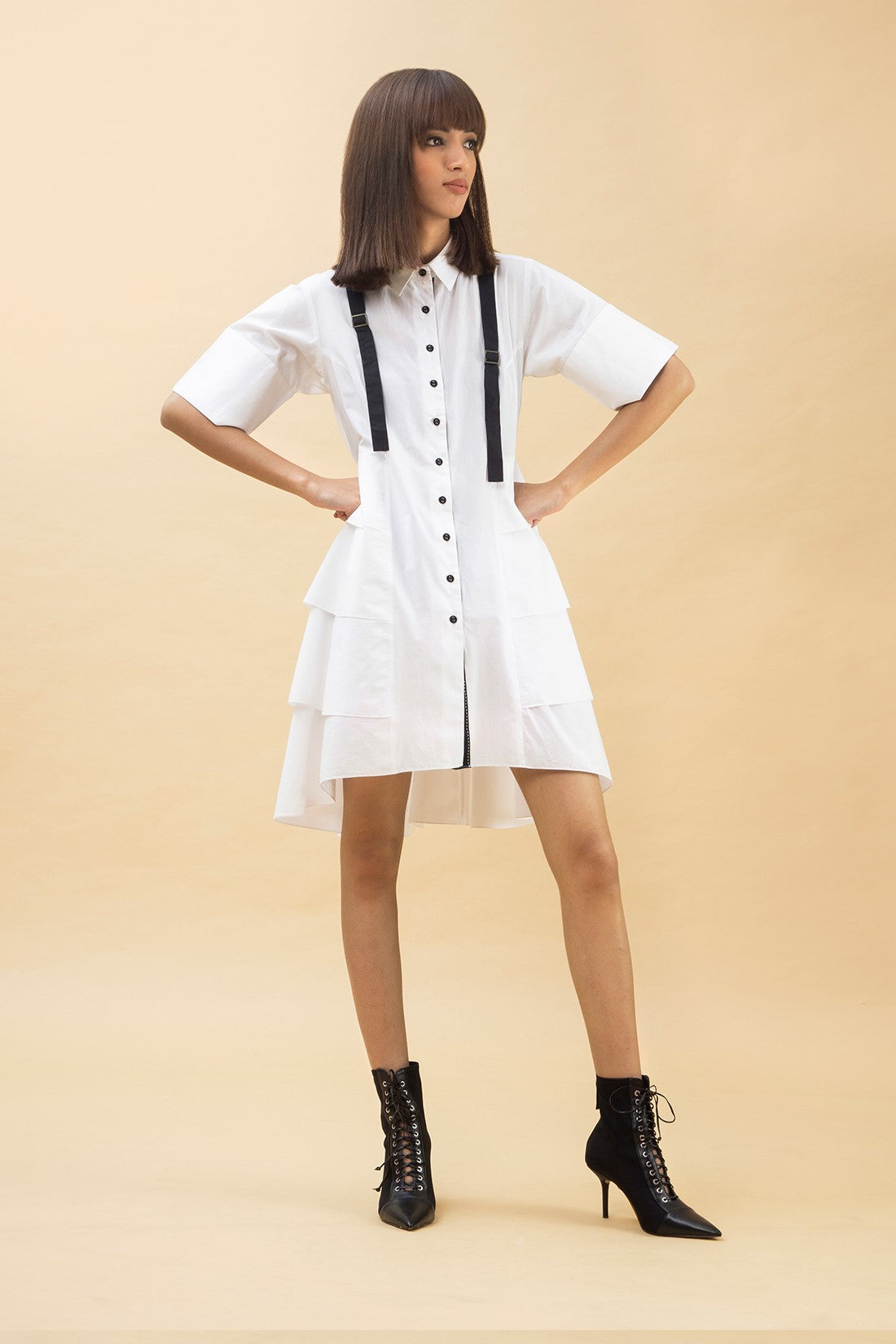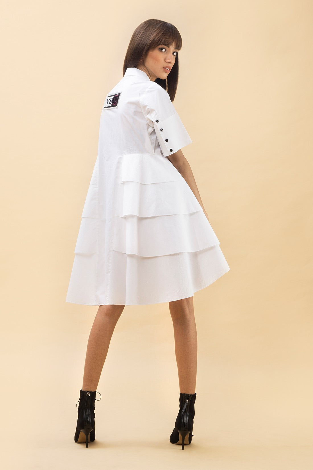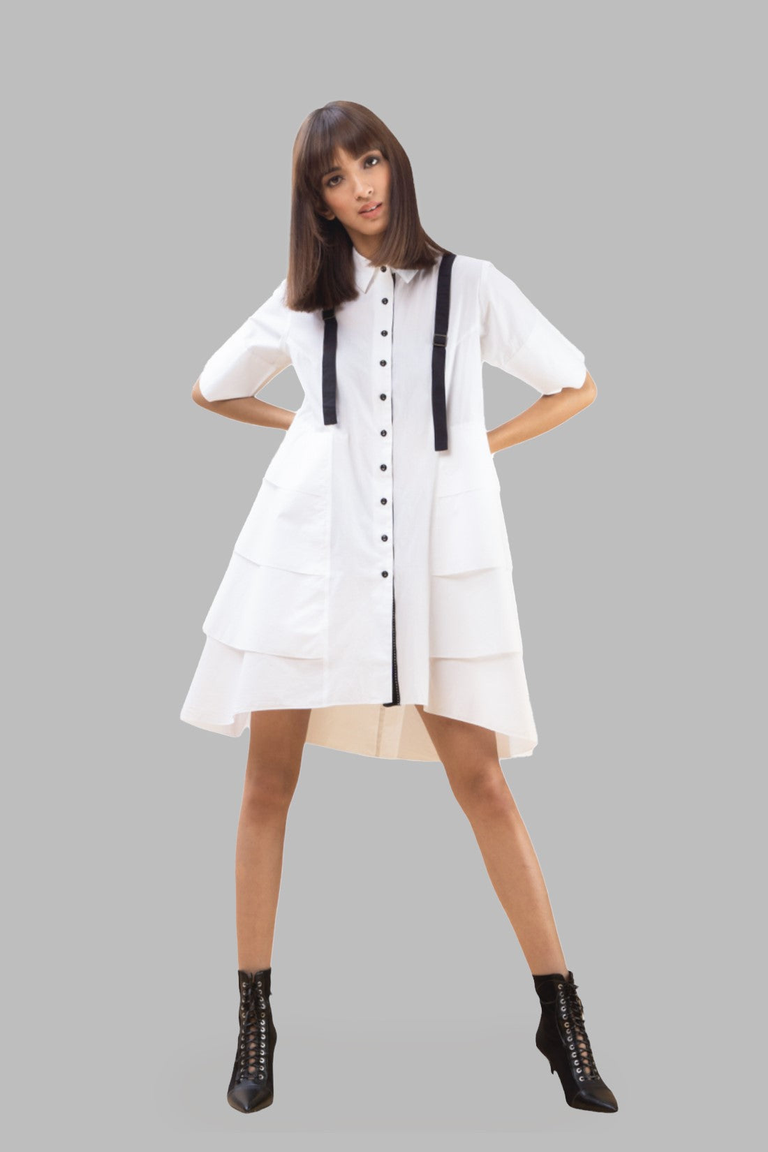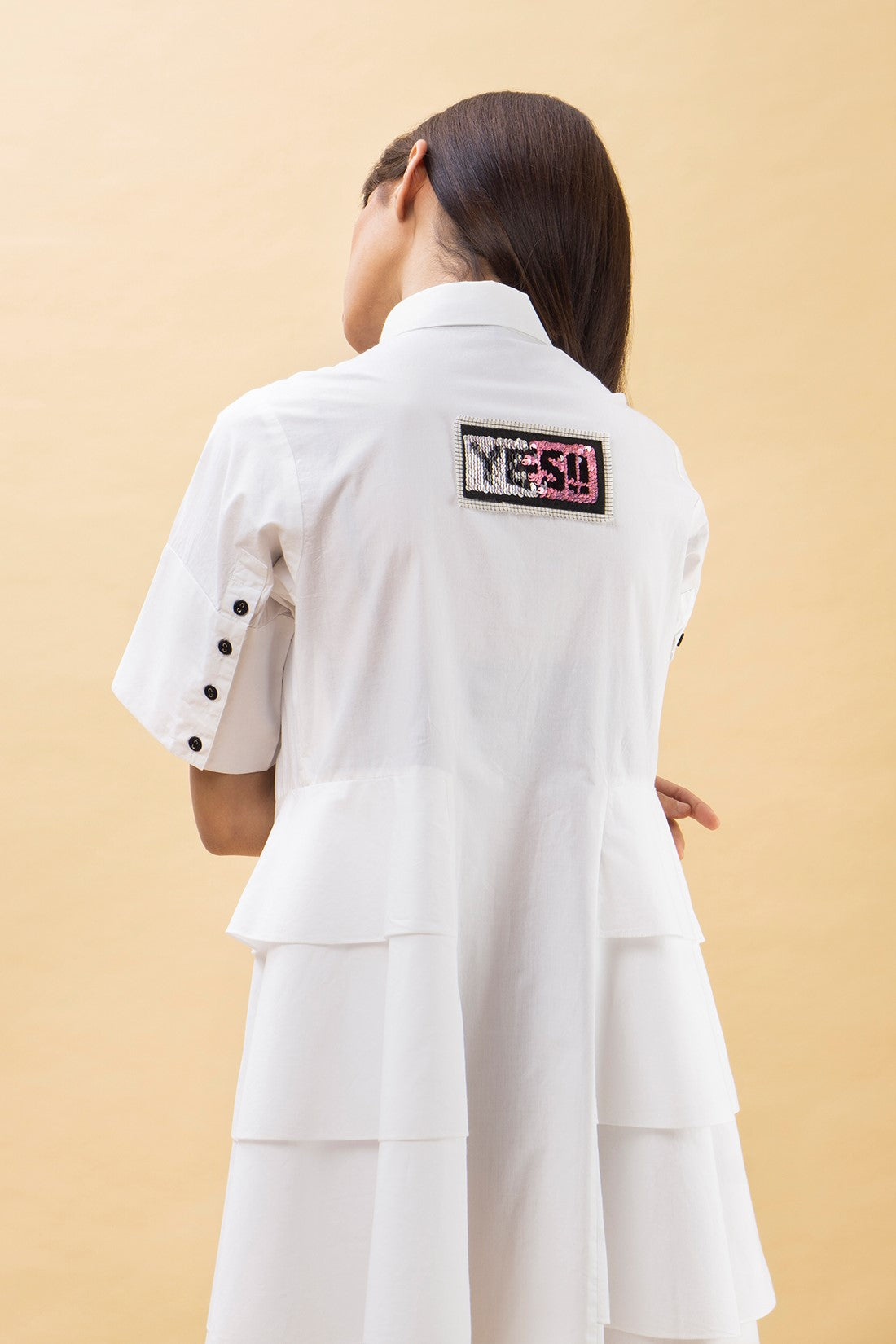A sharp shirt dress with three tier skirt and mid length flare sleeves that features two front straps and interactive sequins at the back