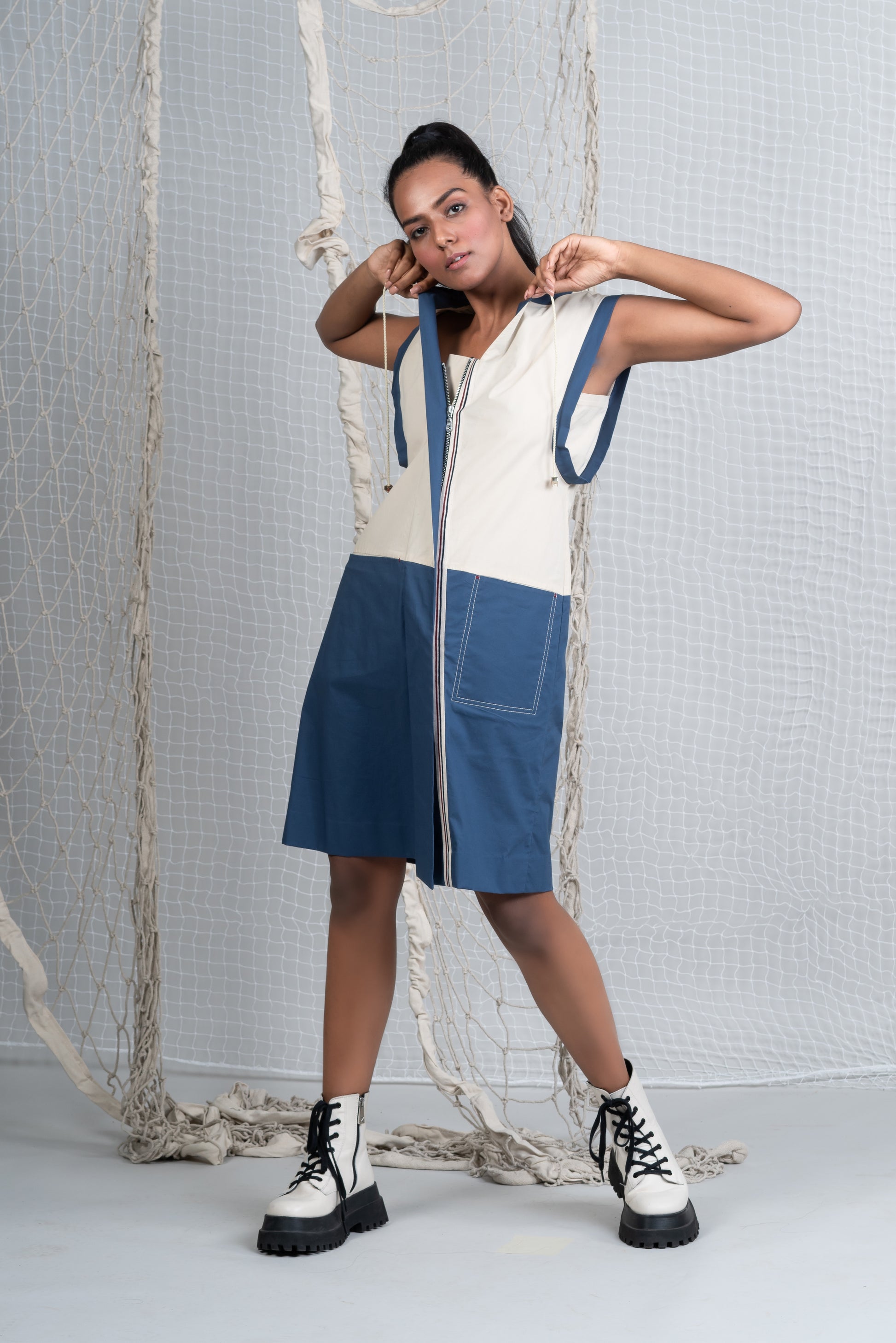 Sleeveless shift dress with colour blocking, asymmetrical opening and pocket details