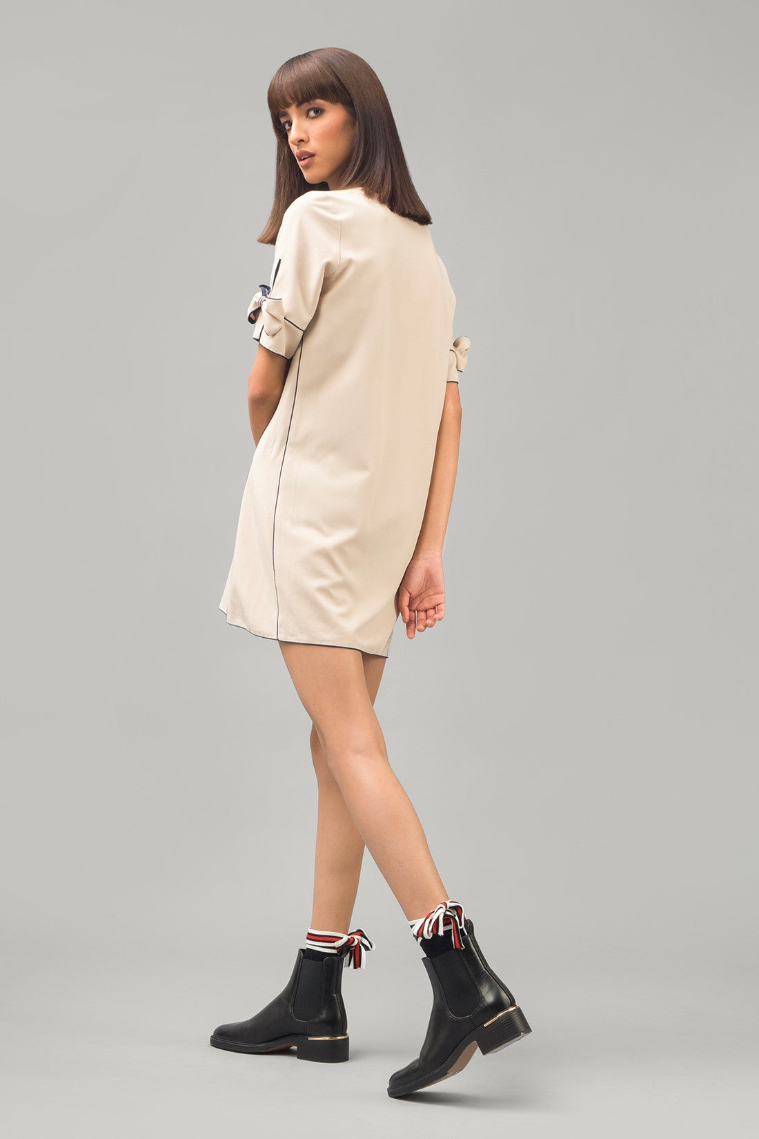 A V-neck short dress with piping details on the seam and bow details on both sleeves