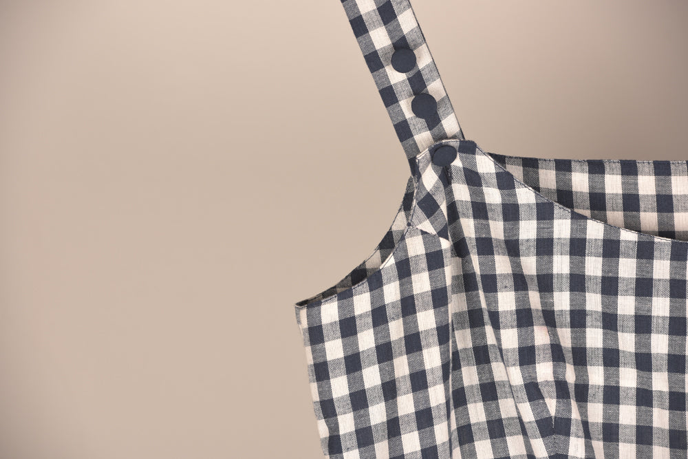 Dress in adjustable strap with handmade button