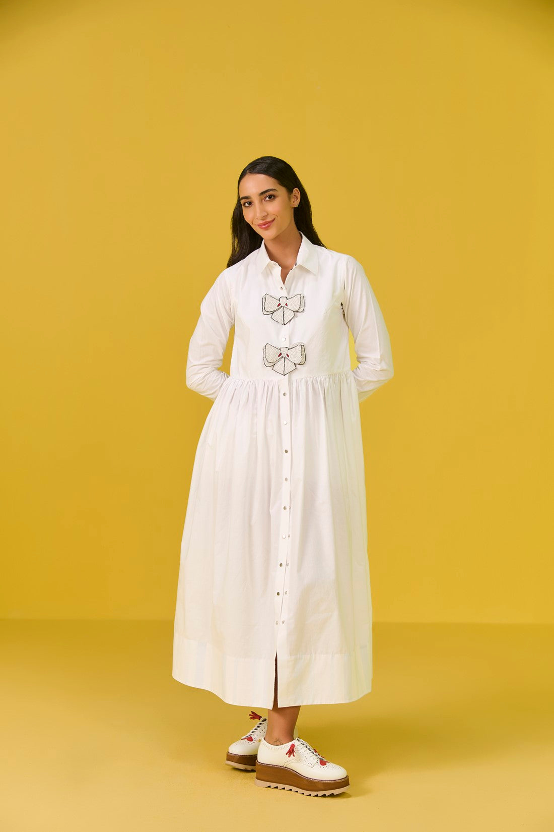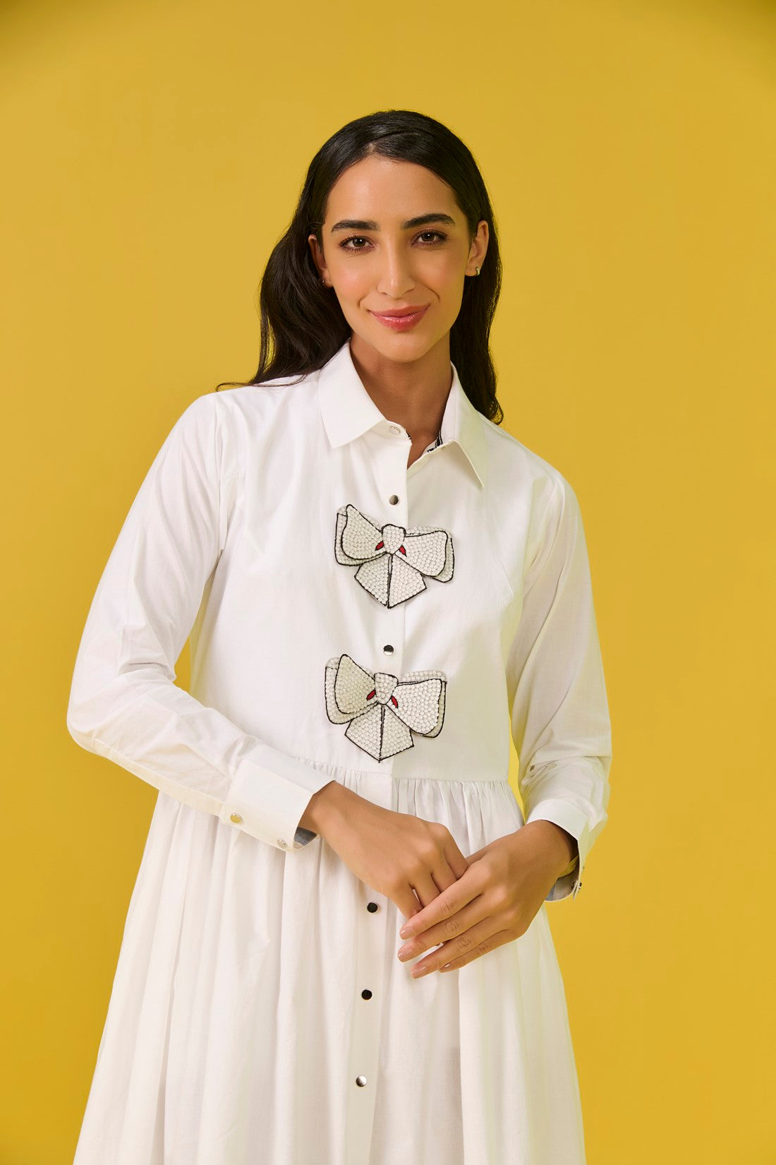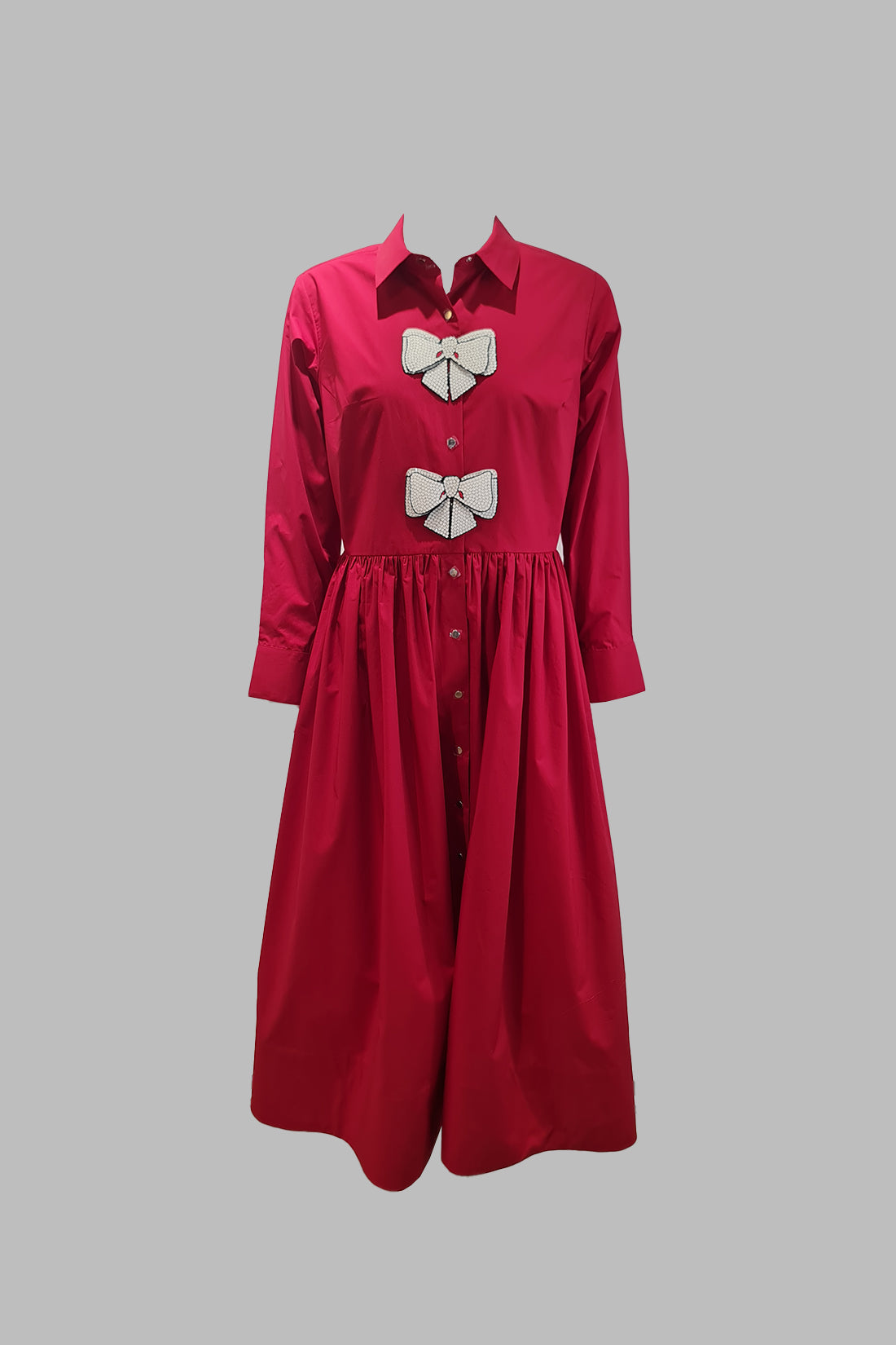 Embrace your inner princess with a dark fantasy in this whimsical long dress crafted for those who adore both charm and edge. The dress boasts an edgy embroidery detail on the back, while the front is adorned with rhinestone studded bows along the placket, adding a playful sparkle.