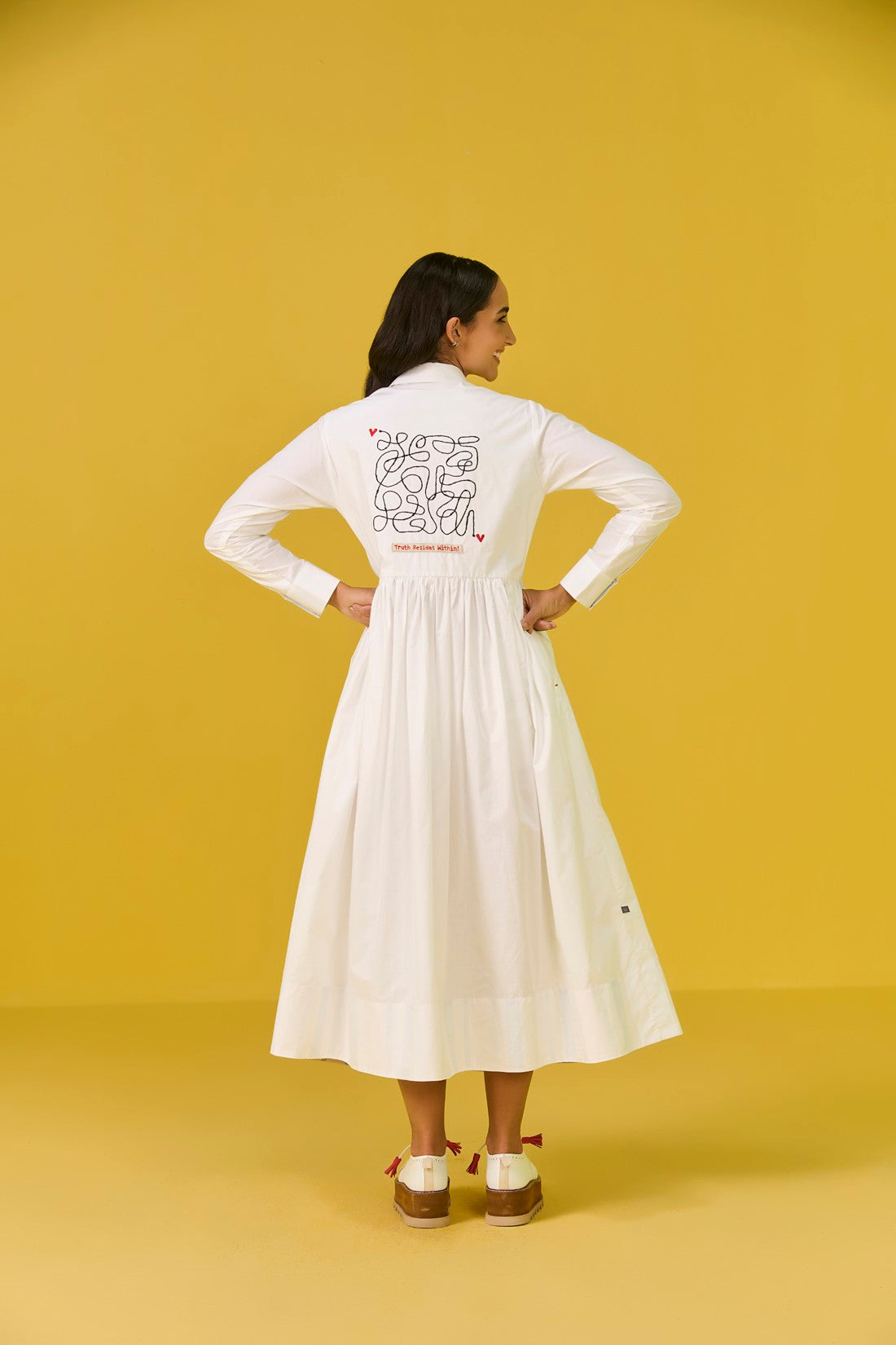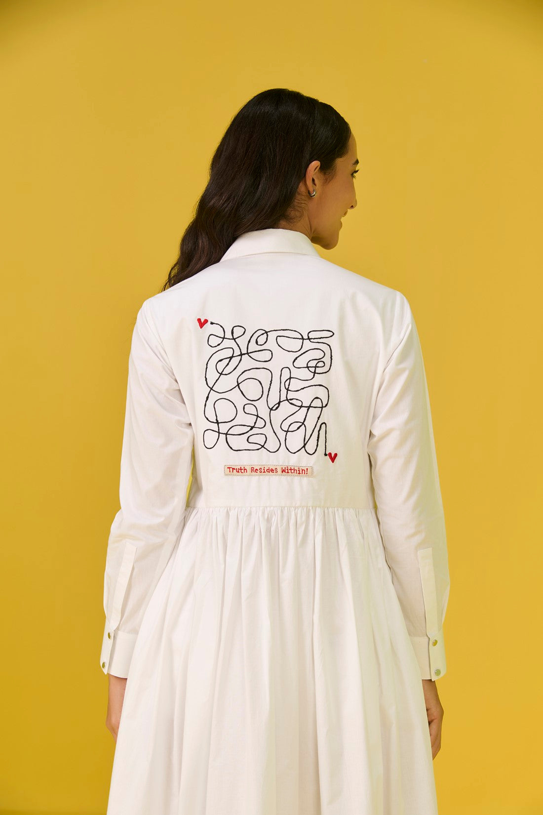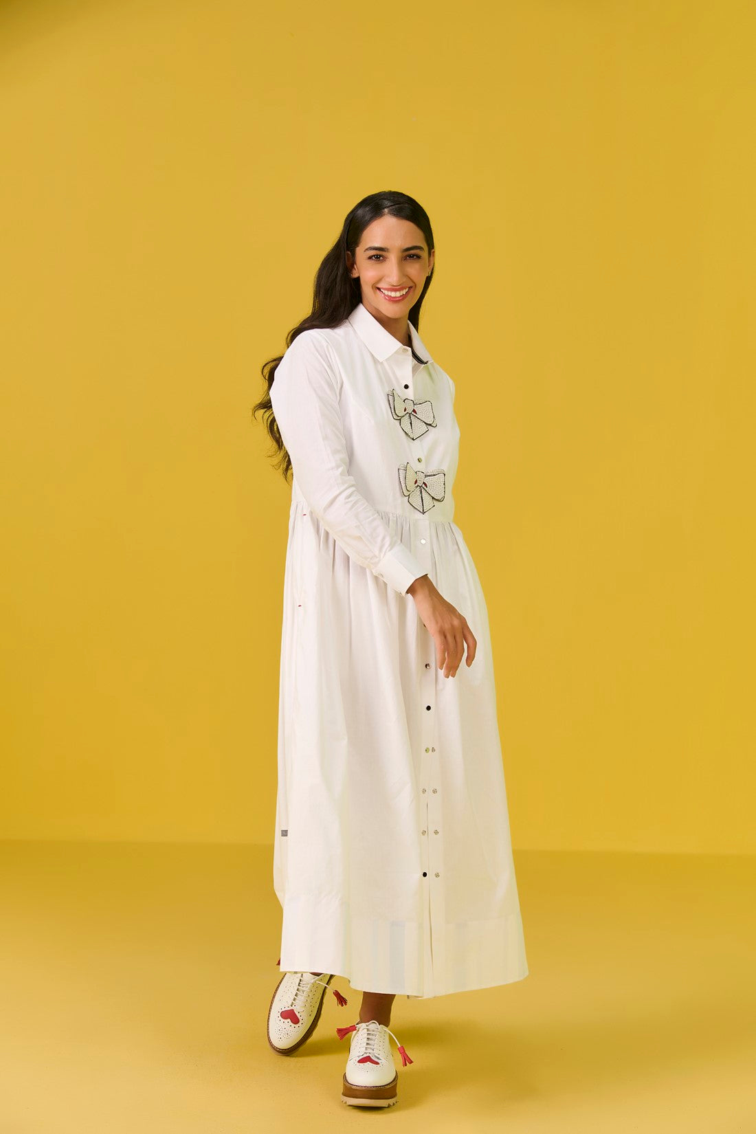 Embrace your inner princess with a dark fantasy in this whimsical long dress crafted for those who adore both charm and edge. The dress boasts an edgy embroidery detail on the back, while the front is adorned with rhinestone studded bows along the placket, adding a playful sparkle.