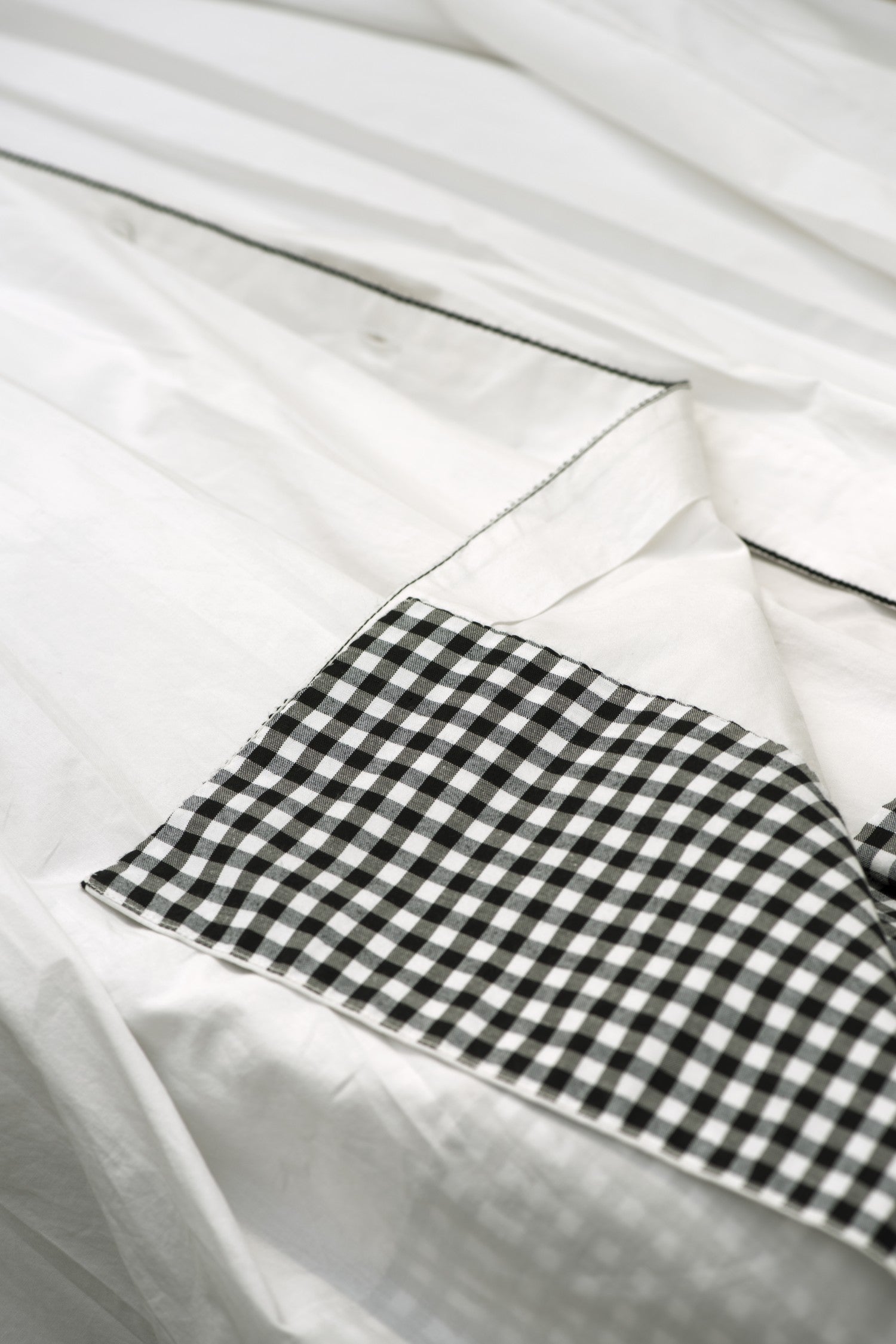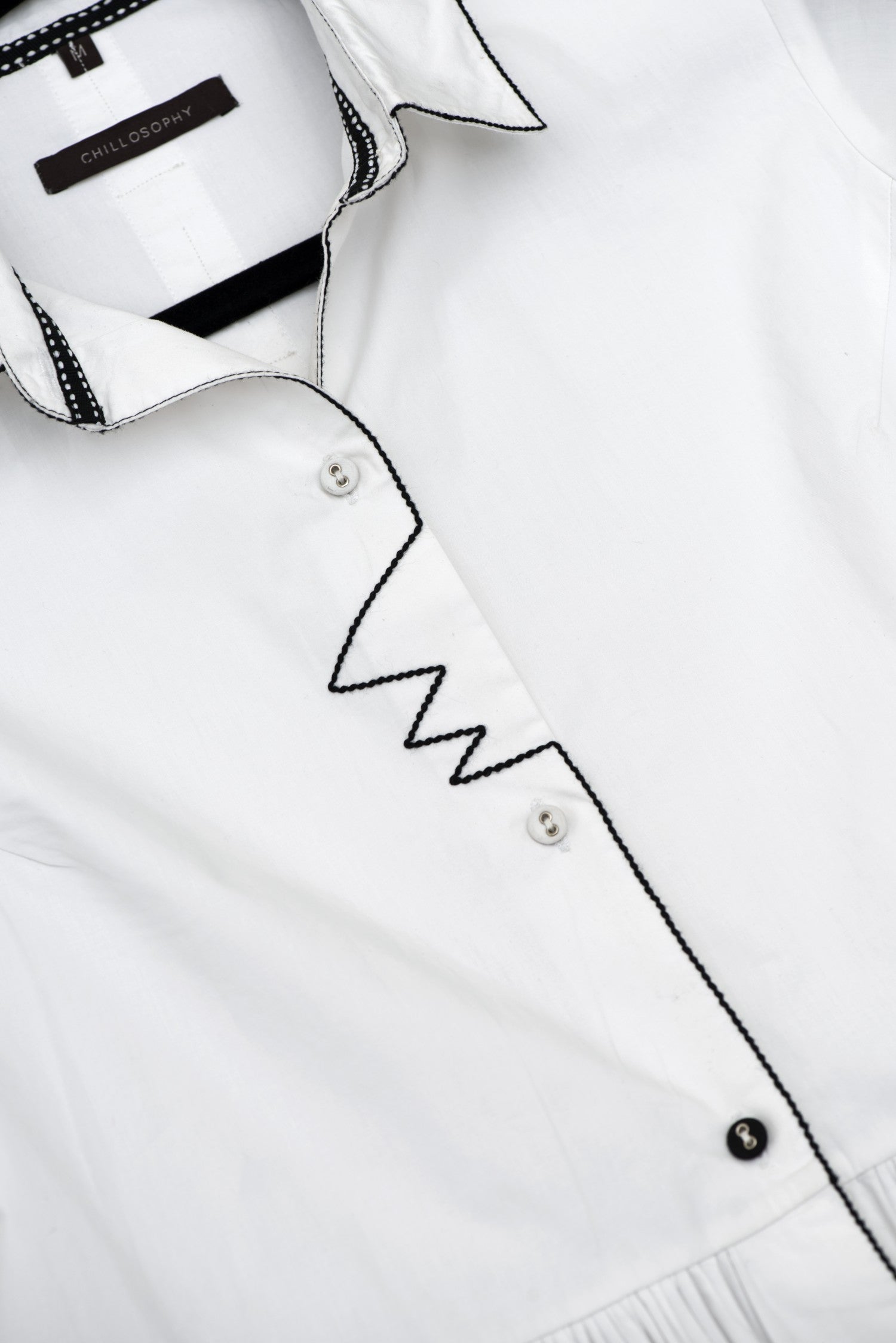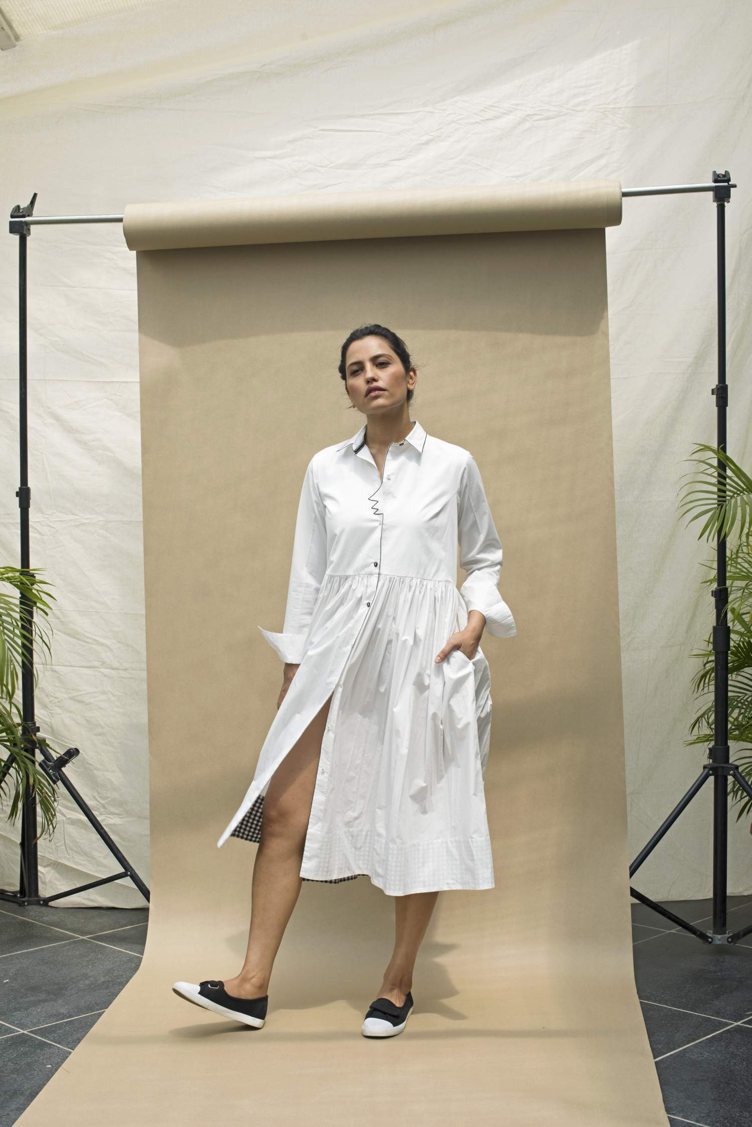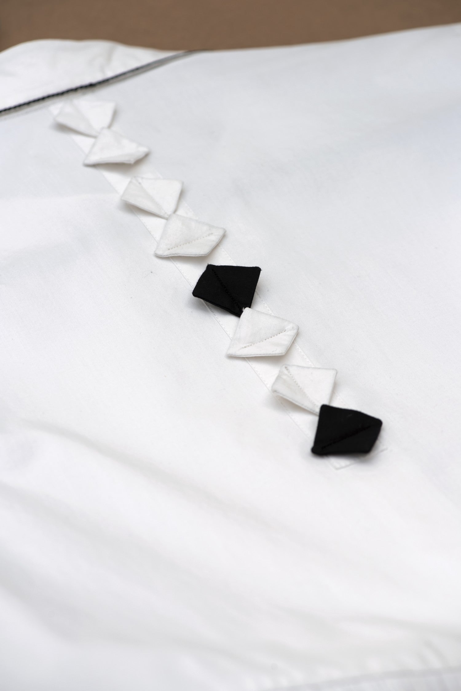 Long smart dress with handstitch details on the front and also handmade black and white origami details at the back