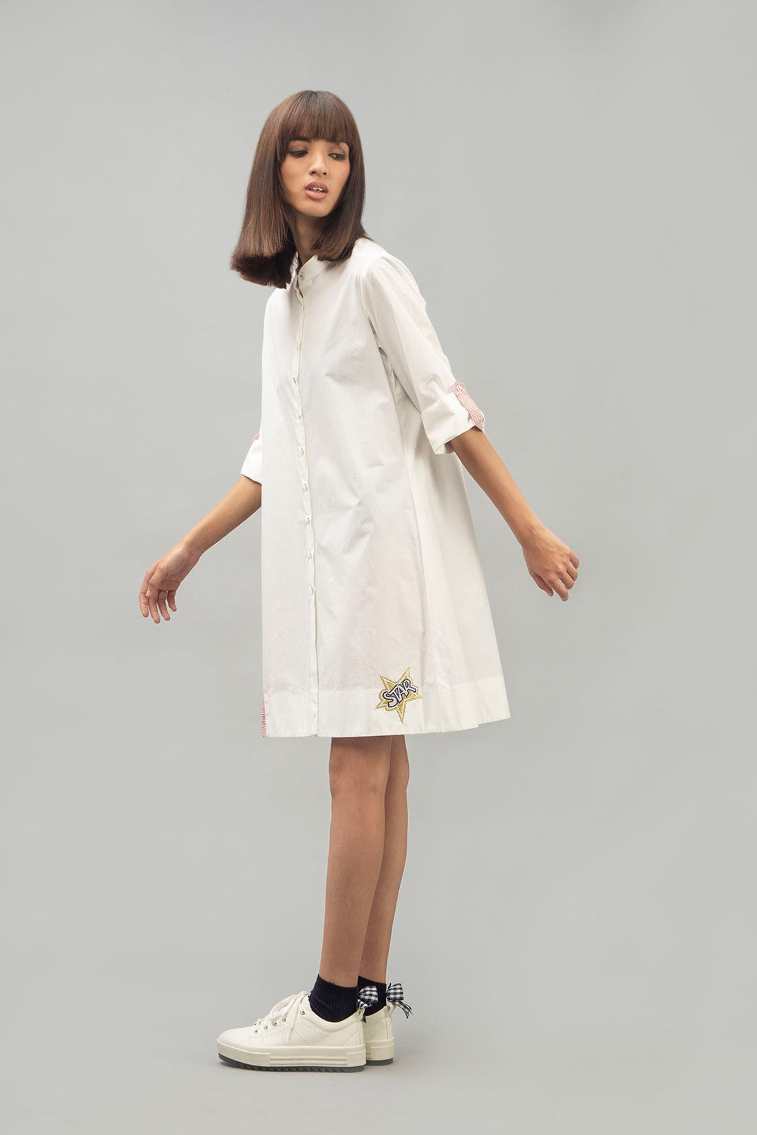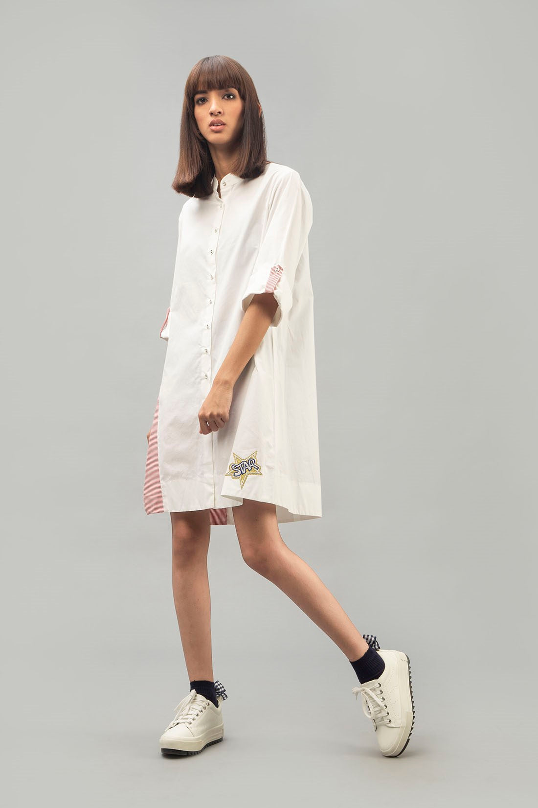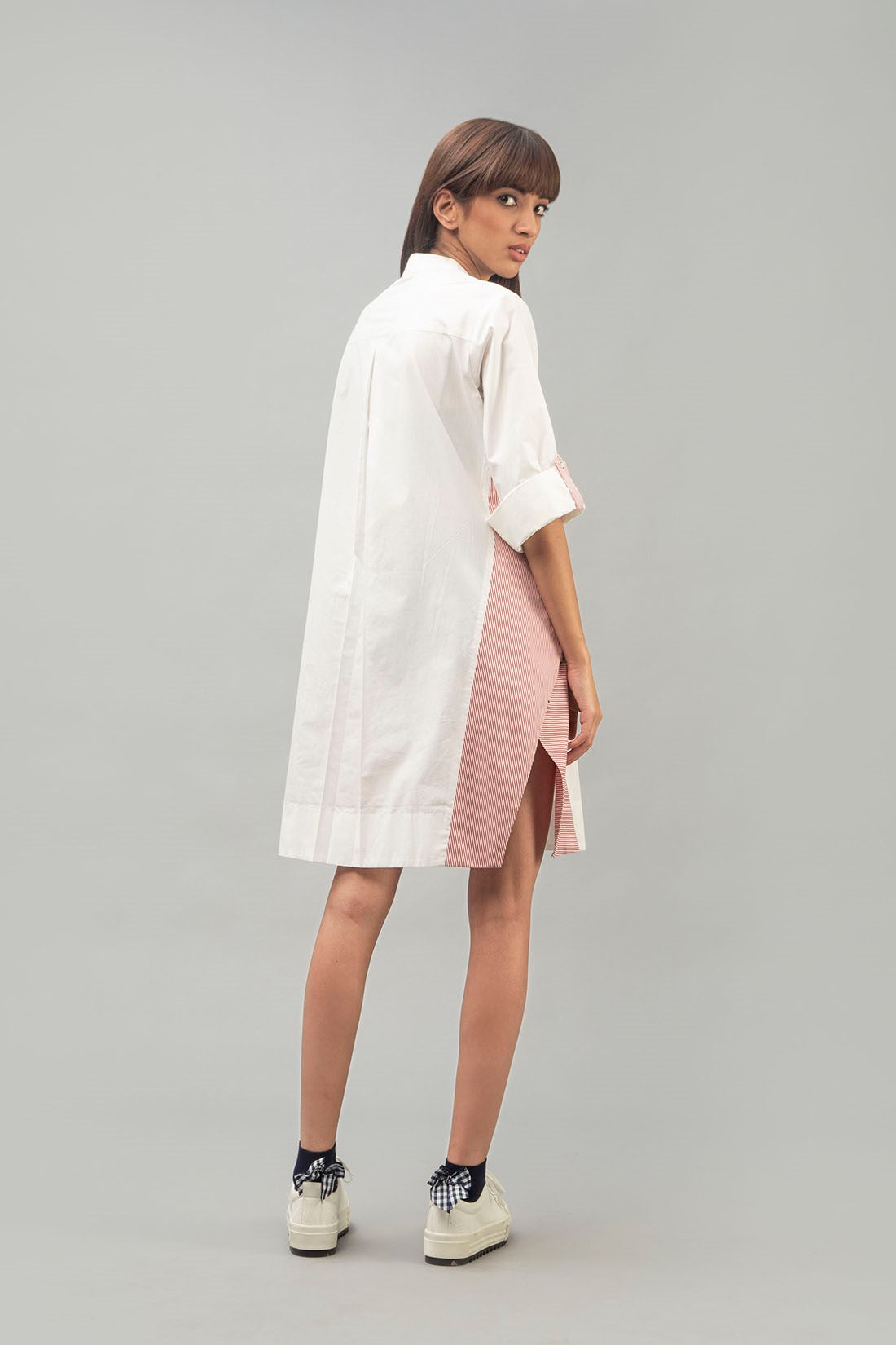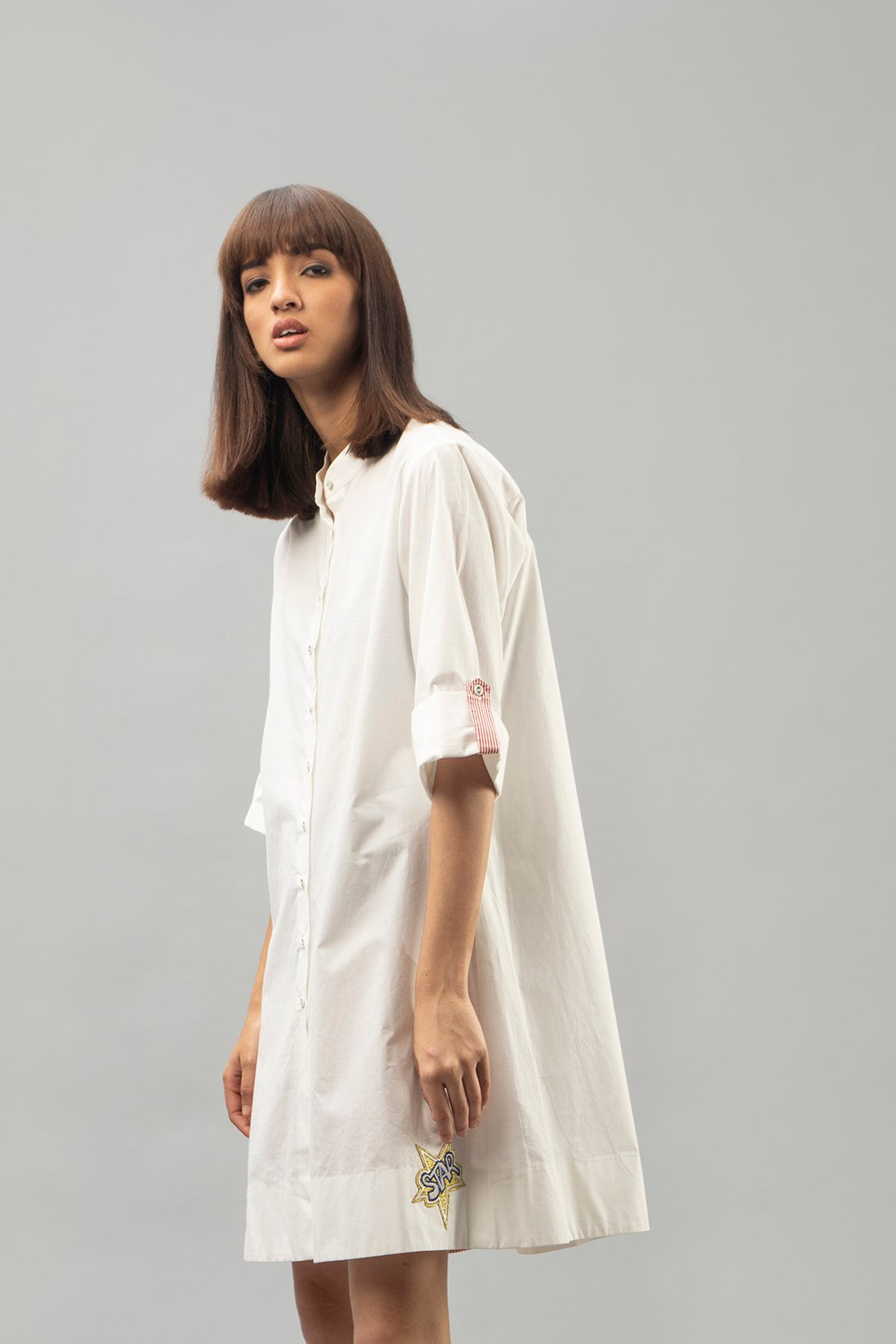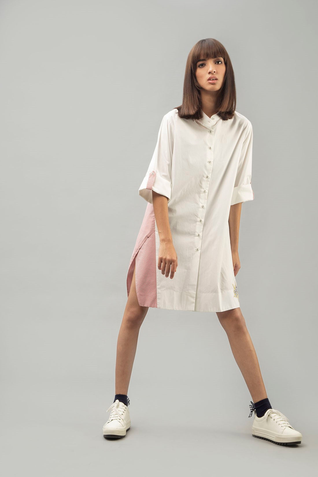 Mid length tunic with round Chinese collar, full front buttons and folded sleeves and side split details