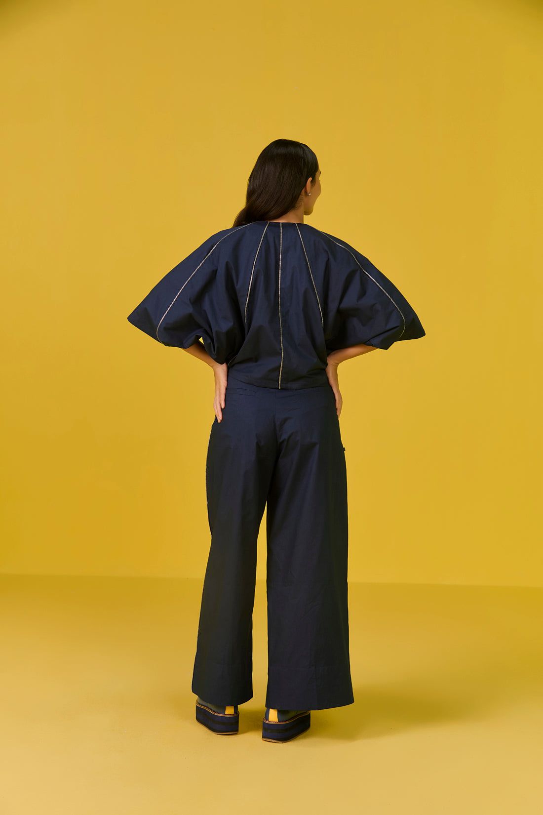 A comfortable Co-ord set featuring a relaxed umbrella-cut top with batwing sleeves, striking zip detailing, contrast lining, and a handmade brooch. Paired with asymmetric flared trousers — one side with dramatic box pleats, the other sleek — this set delivers effortless edge and standout style.