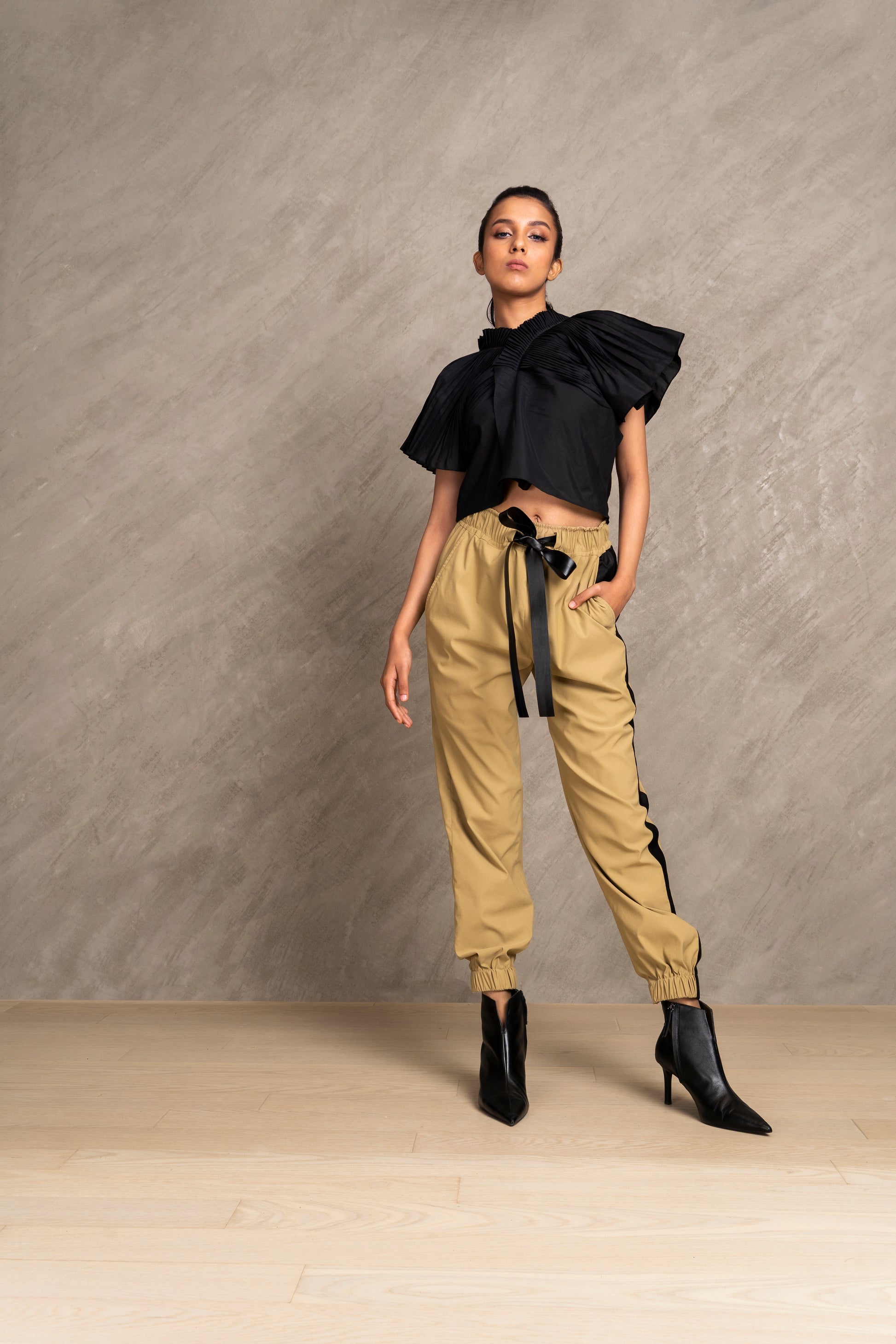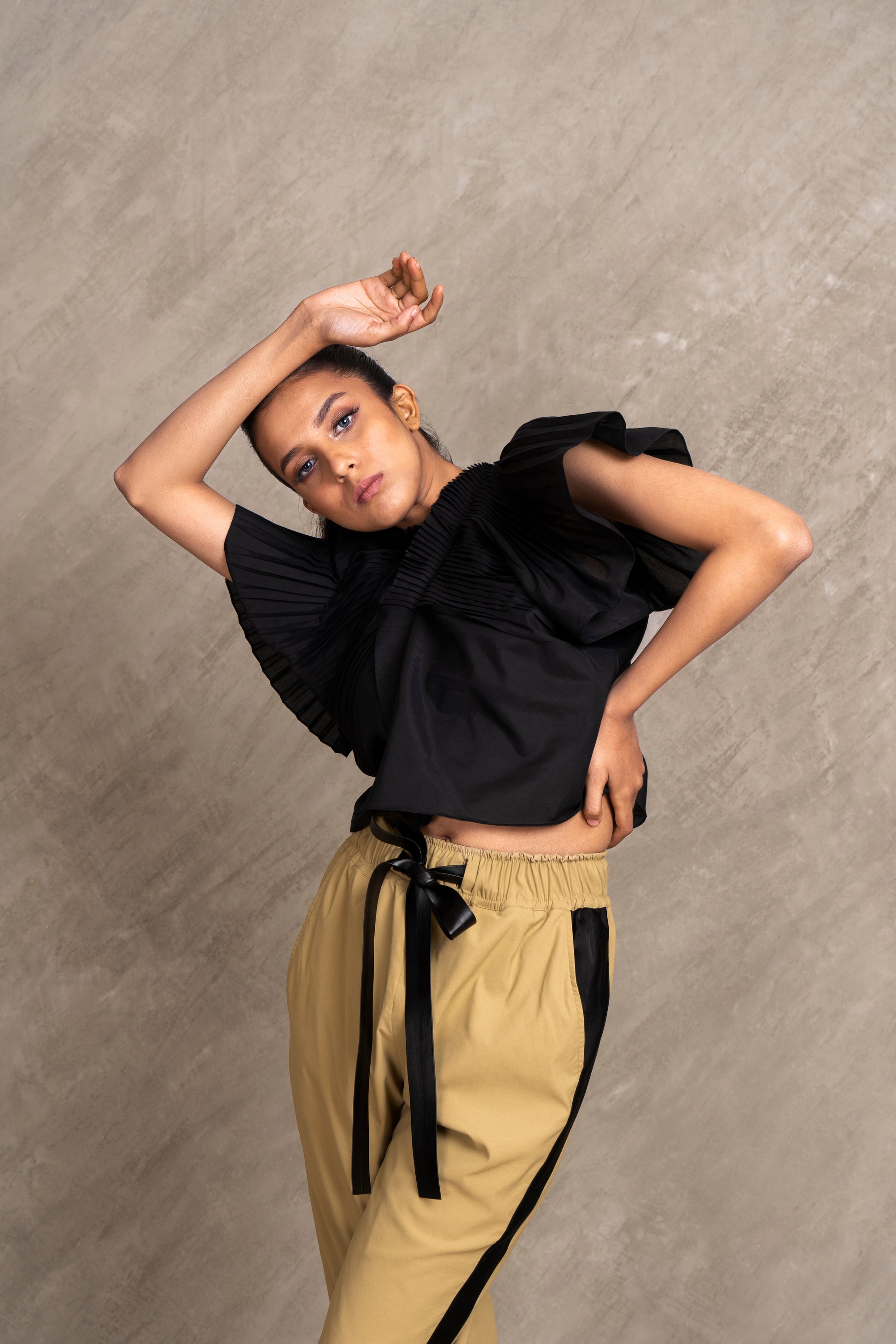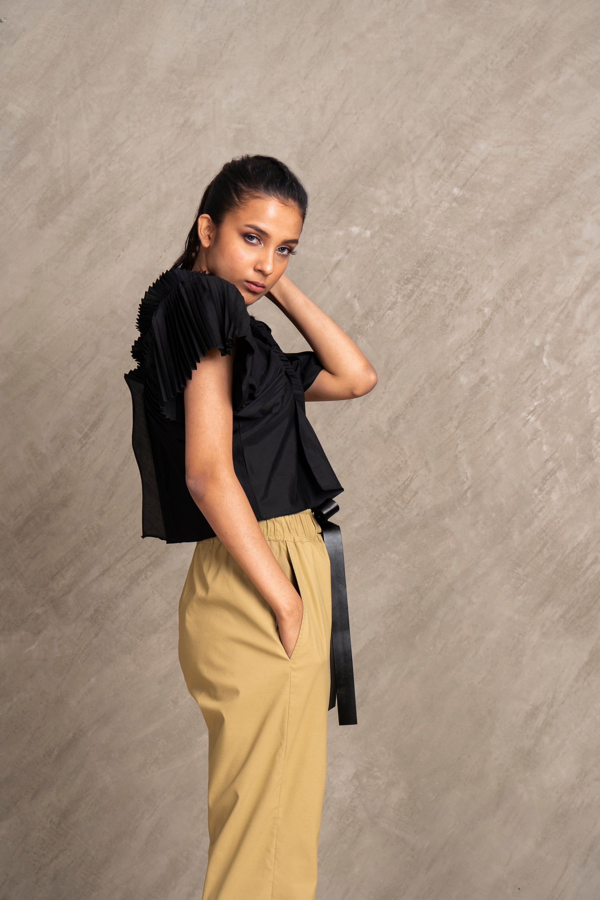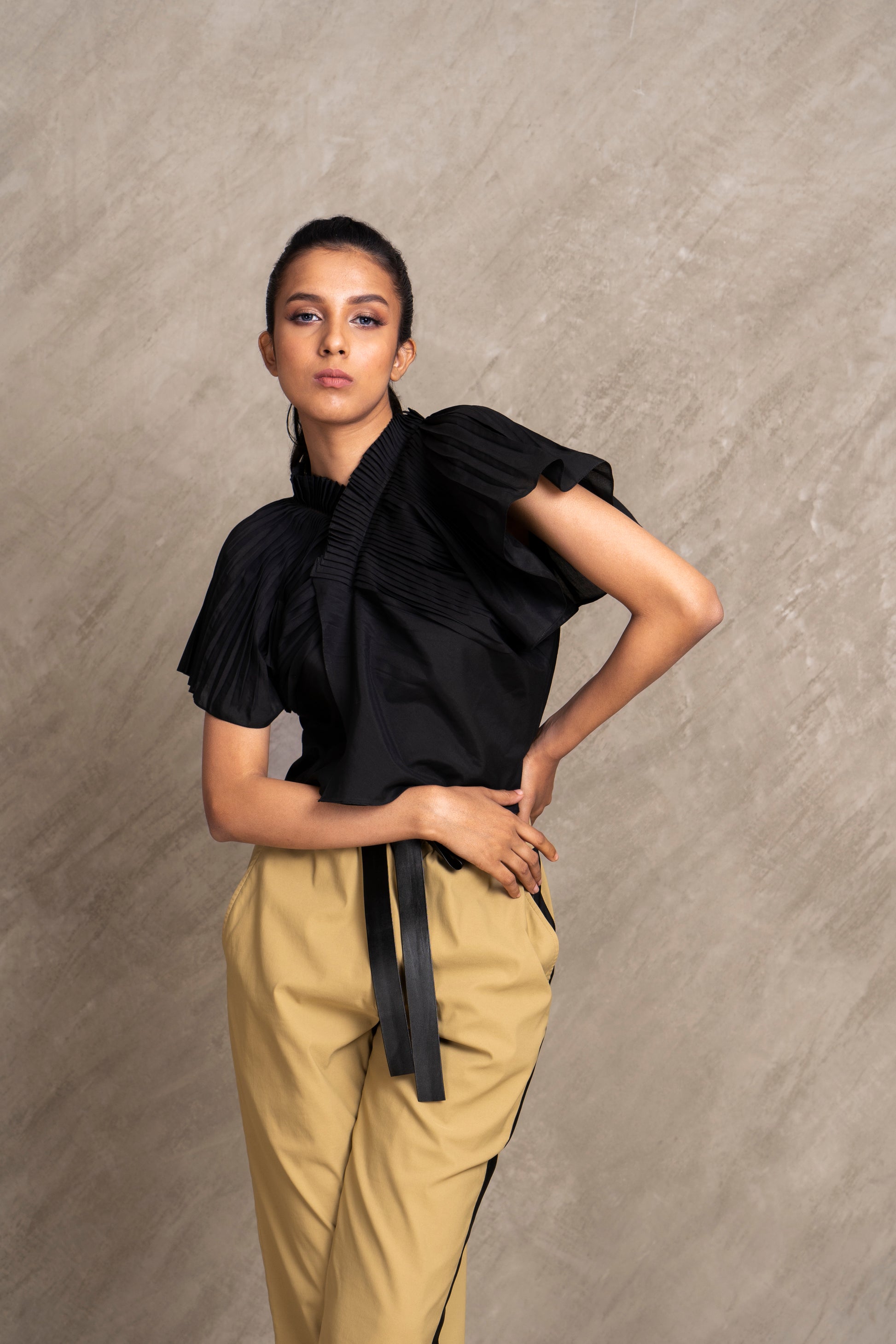 Funk up your look in our structural cross body top created with fabric manipulation. A must have for your modern wardrobe. Pair it with our CROFT pants to add that edgy flair.