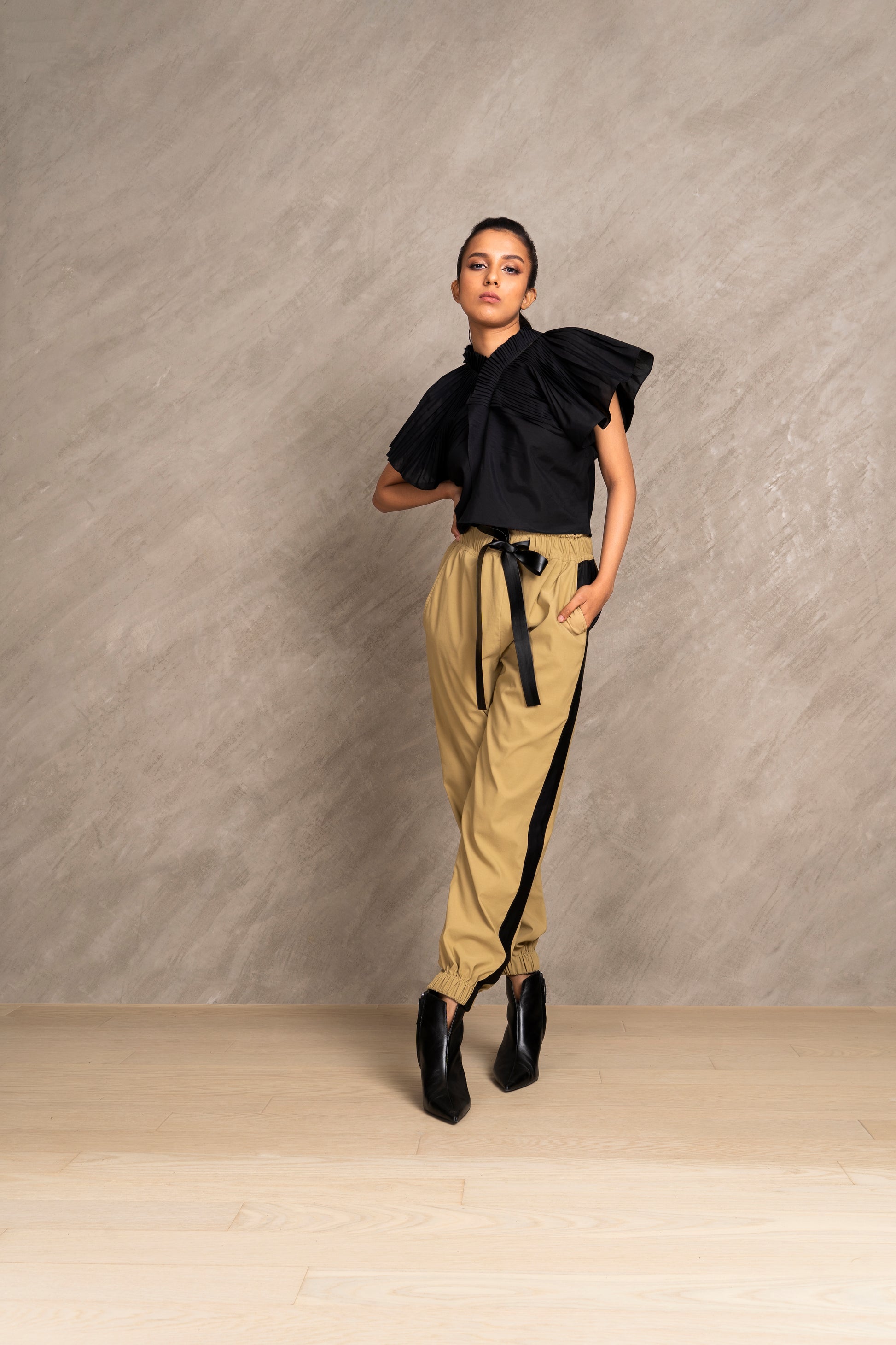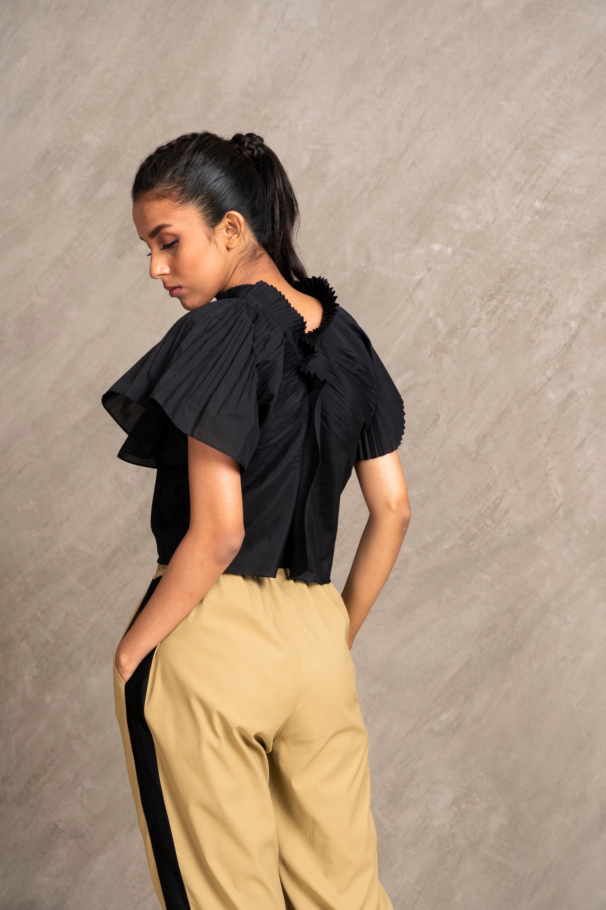• Pleated details on the shoulder sleeves