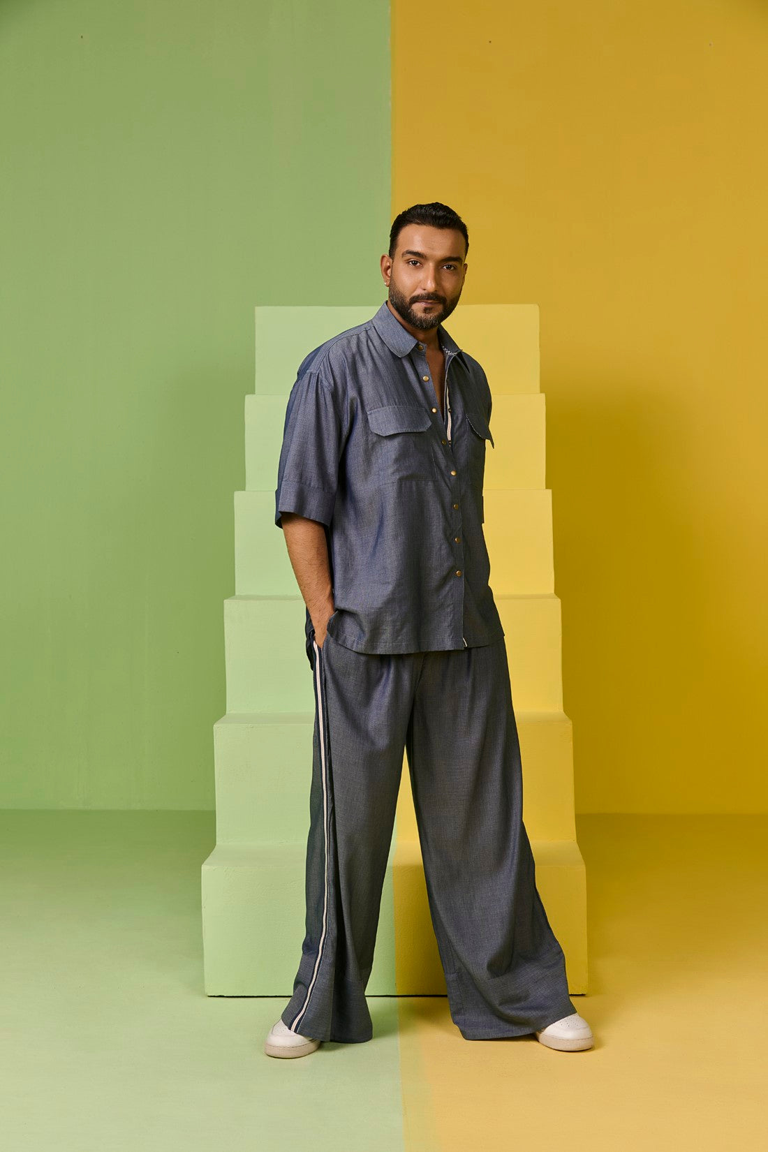 These trousers are cut wide and clean with a dramatic hem. Contrast lace along the side seams adds a tonal break. Contrast colour facing on the hemline adds character to this super flowy outfit. Coordinate your look with our Groovio shirt to amp up your style quotient.